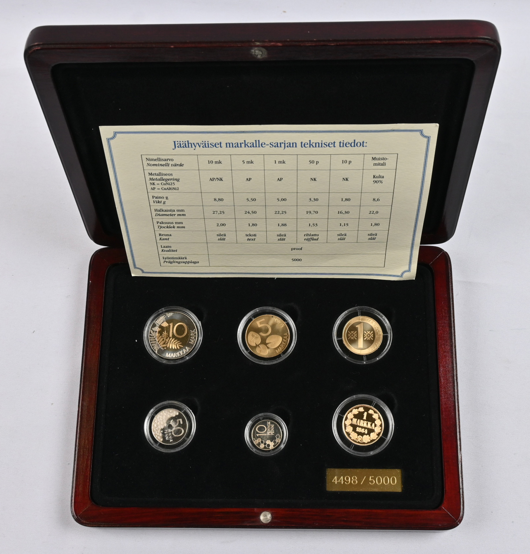 2001 Jäähyväiset markalle -kokoelma, jossa myös kultainen jetoni. Aitoustodistus