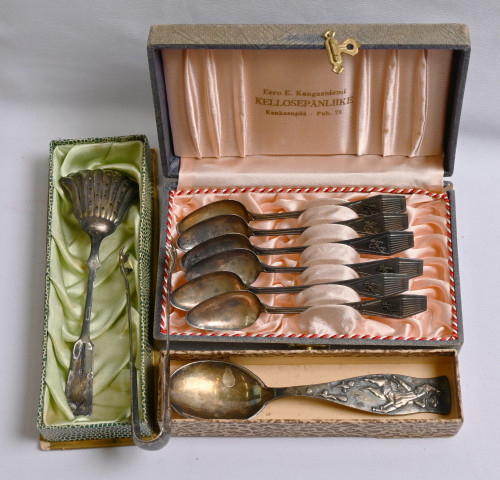 Pikkulusikoita kuusi kpl monogramilla hopea (830) ja kolme otinta mm. sokeripihdit hopeaa