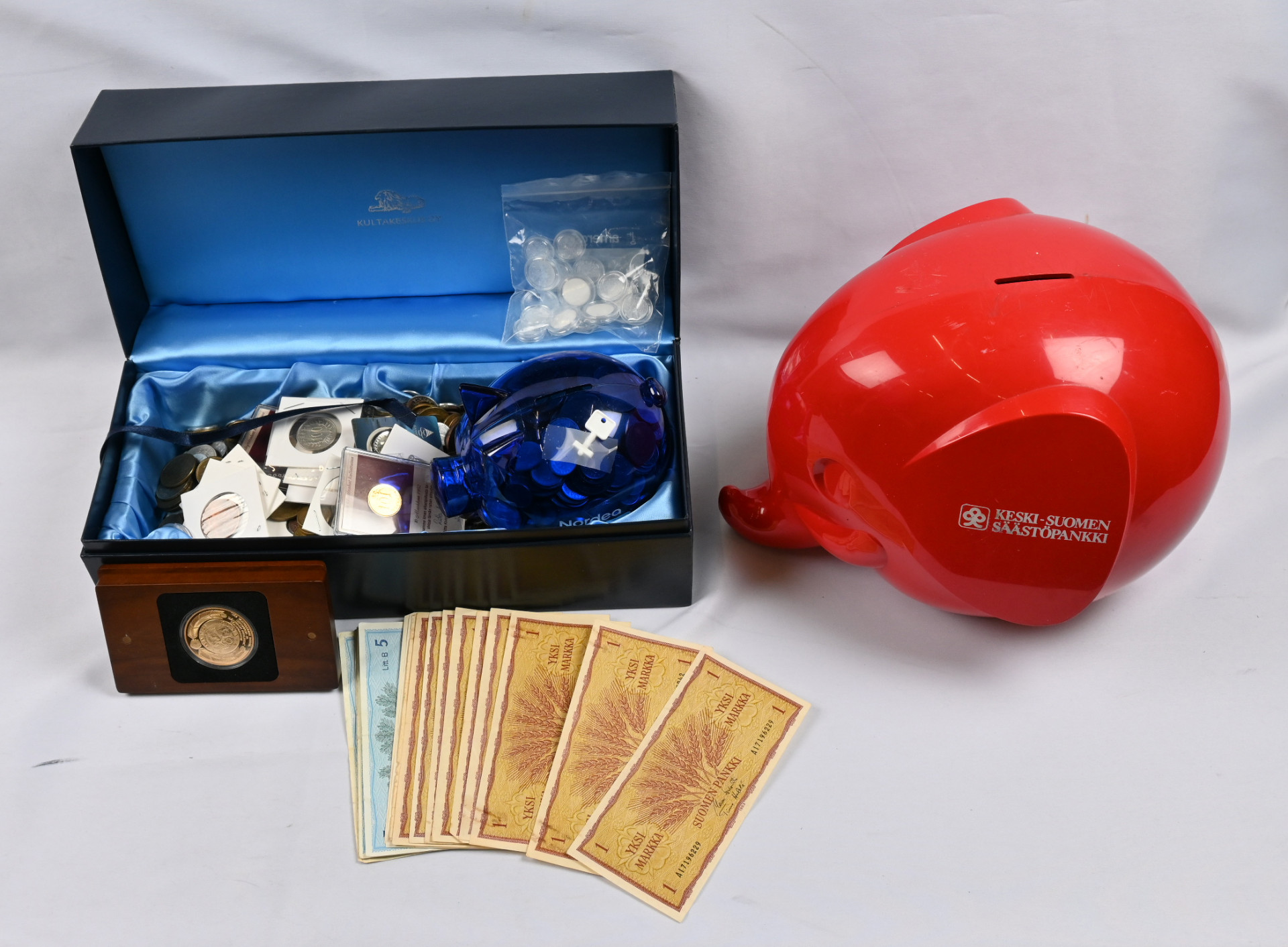 5 KG sekalaisia suomalaisia kolikoita, lisäksi rahasarjoja, seitsemän 5€ juhlarahaa, iso säästölipas, seteleitä jne.