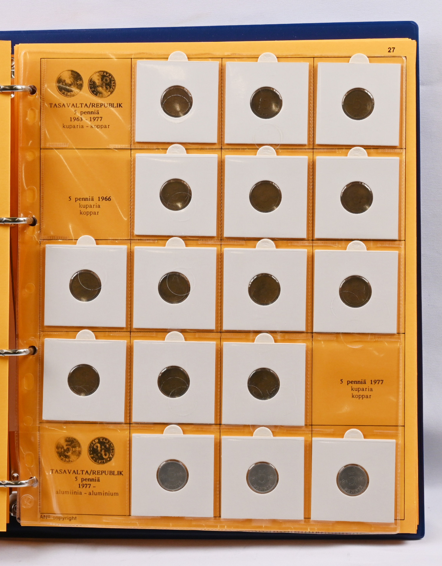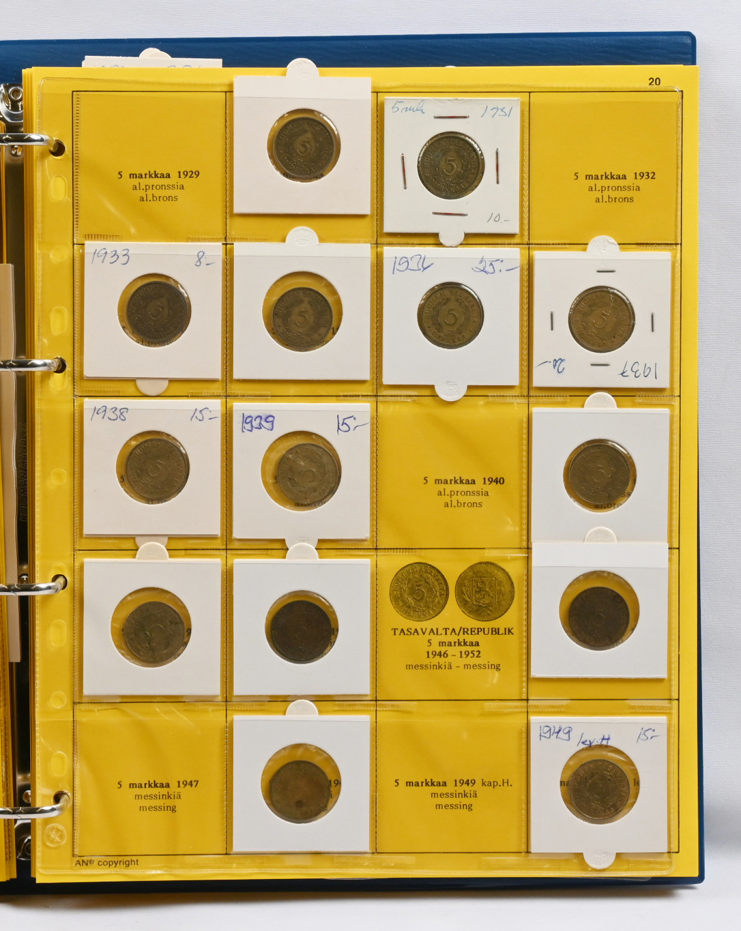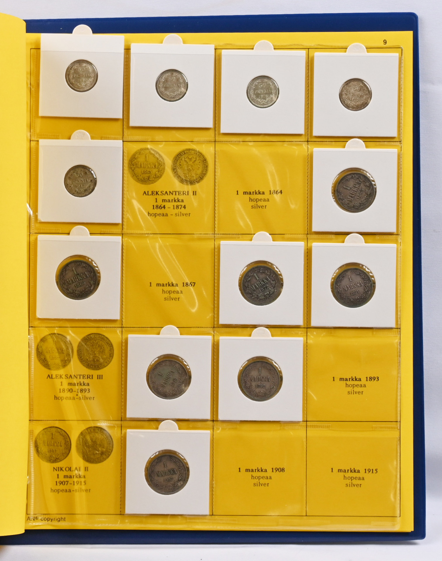 Kolmessa kansiossa peruskokoelma kolikoita alkaen 1800-luvulta mm. hopeakolikoita ym. Lisäksi mapissa pieni seteli kokoelma mm. 1945 1000 markkaa Litt. A jne