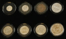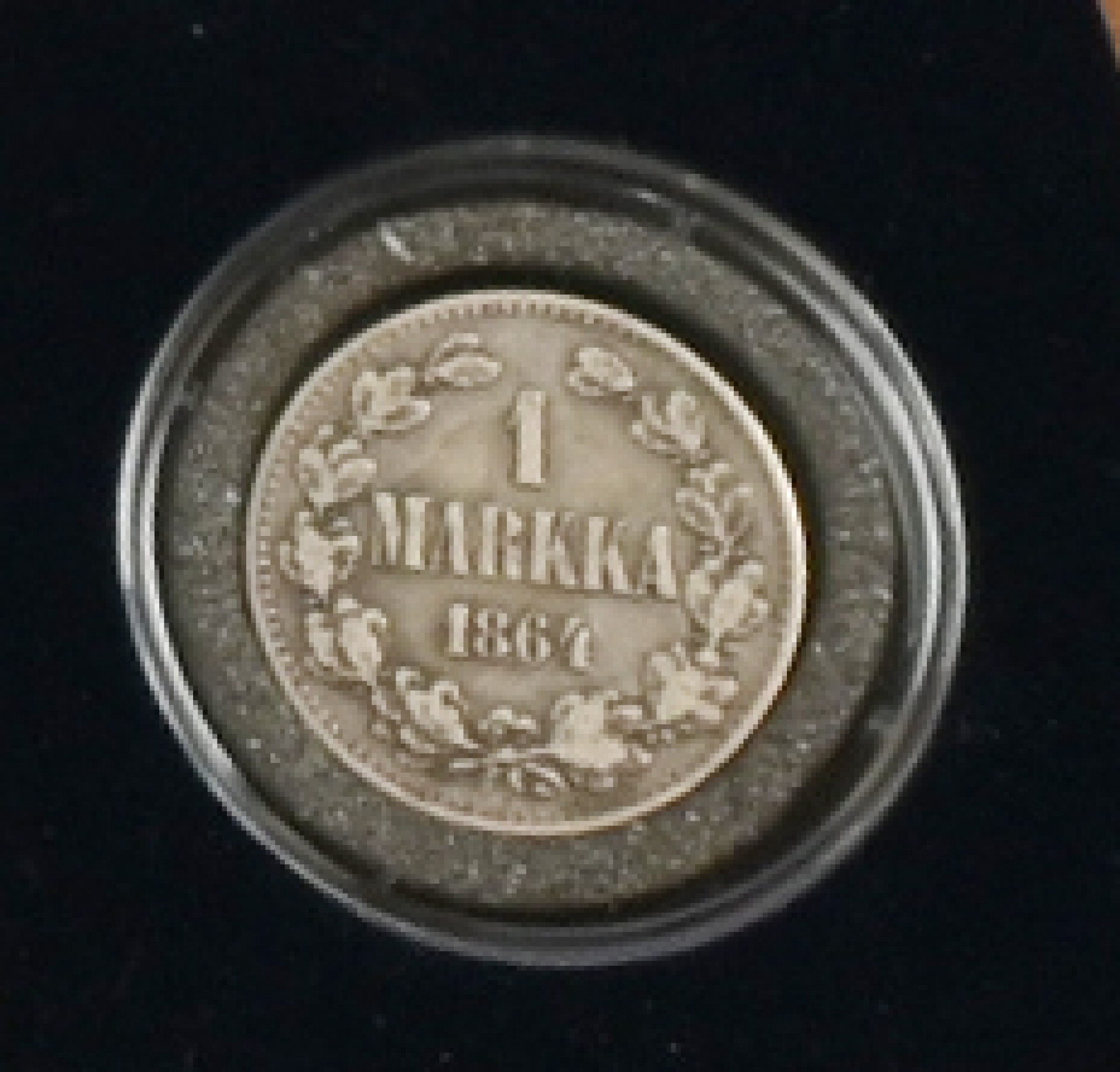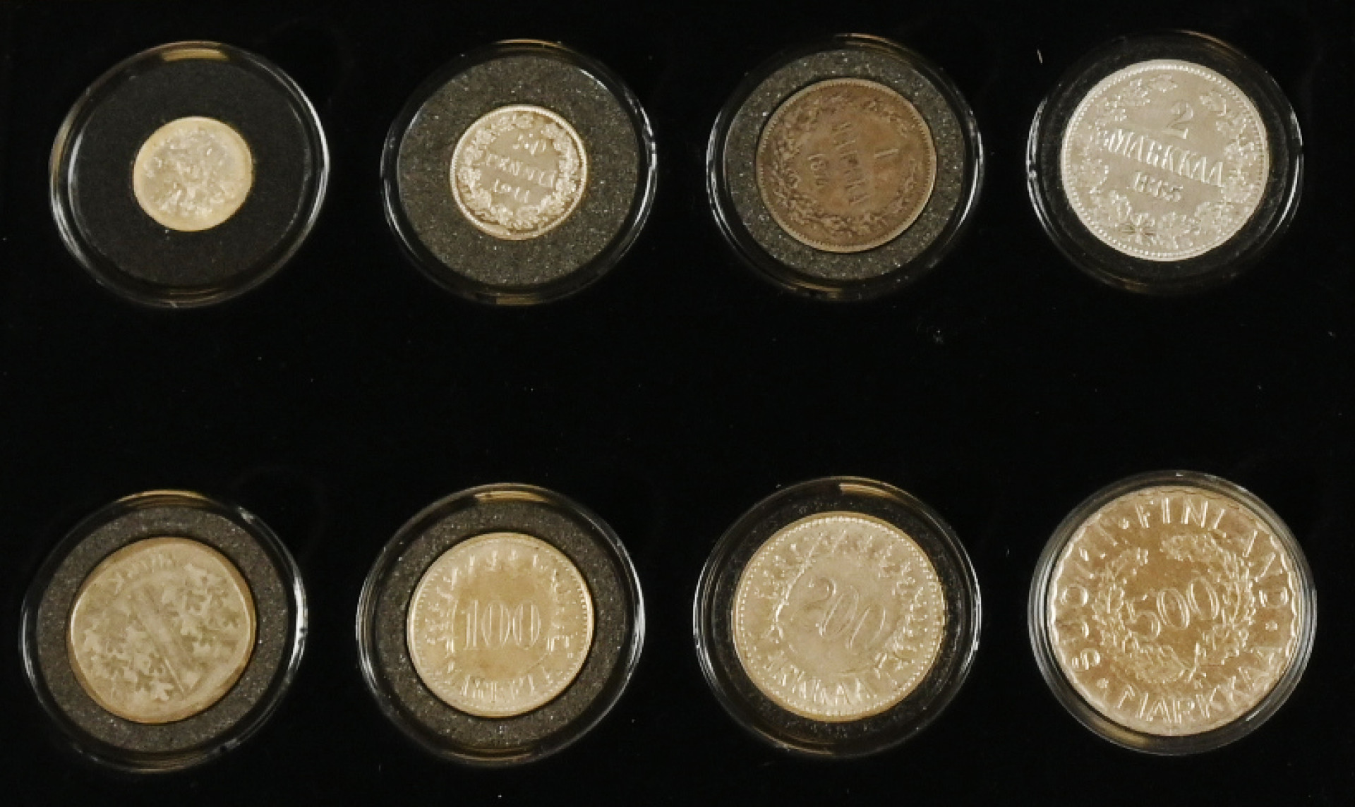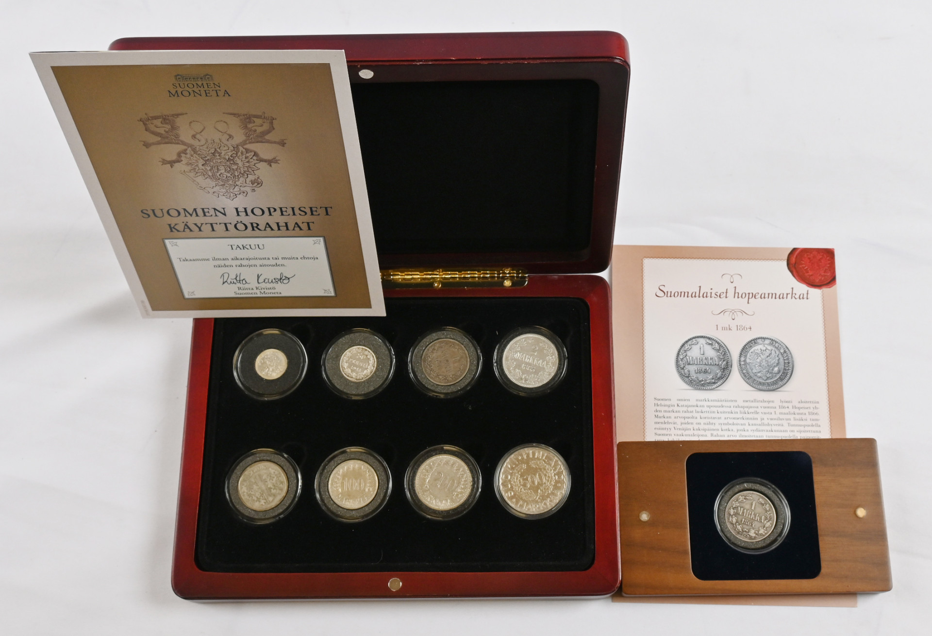Monetan ”Suomen hopeiset käyttörahat” -kokoelma. Kahdeksan hopearahaa puulaatikossa. Lisäksi yksi vuoden 1864 hopeamarkka rasiassa. Aitoustodistukset