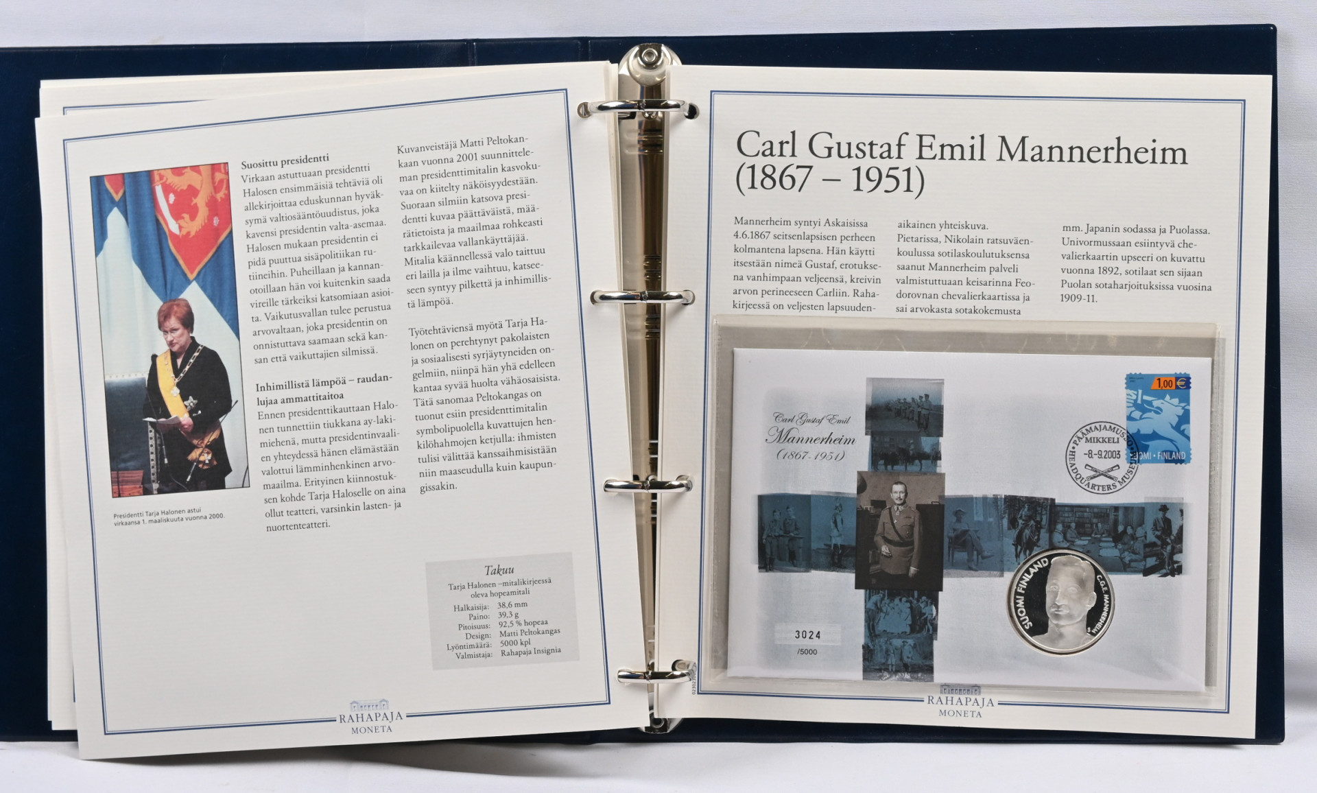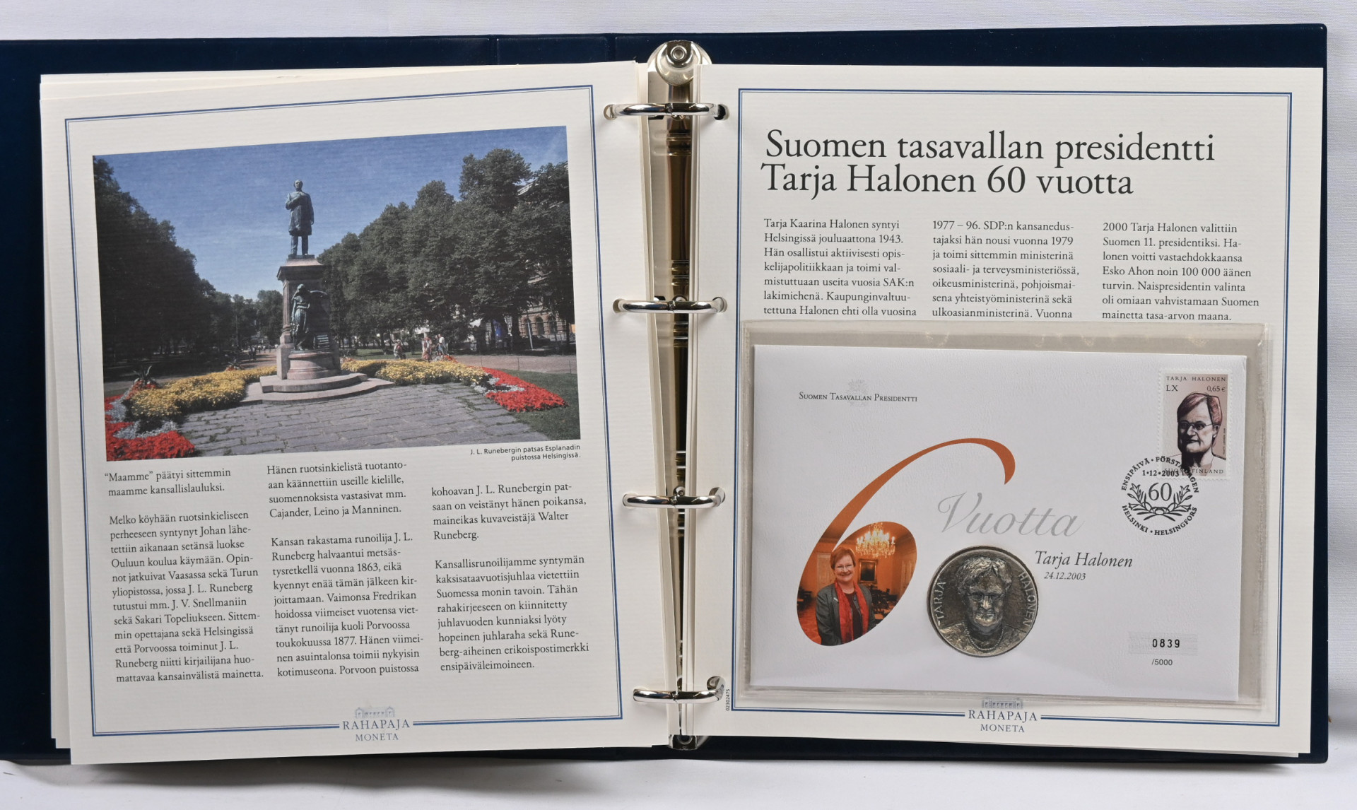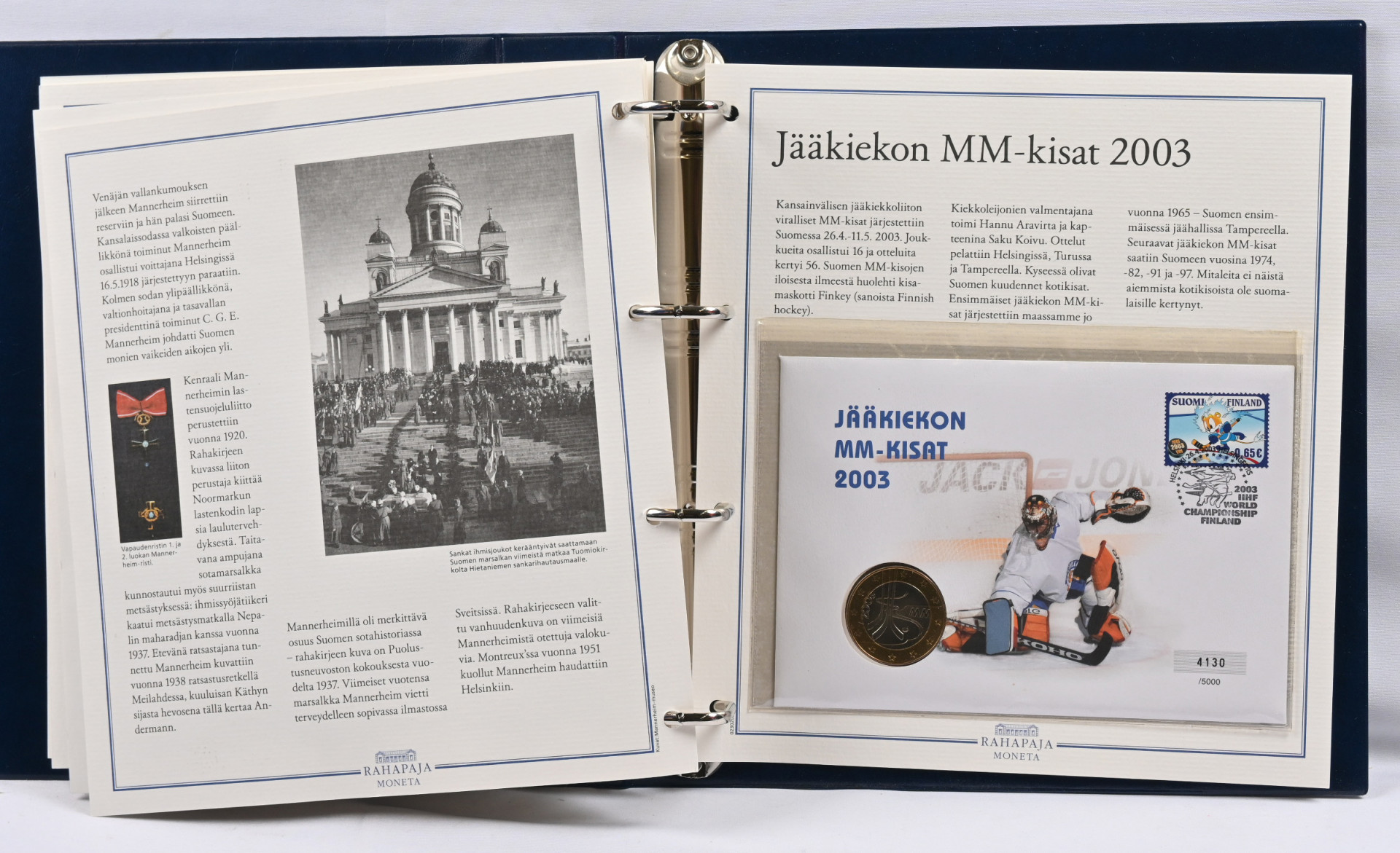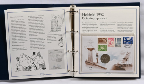 Monetan rahakirjeitä kahdeksan erilaista kansiossa. Olympia, Muumi, Sibelius ym.