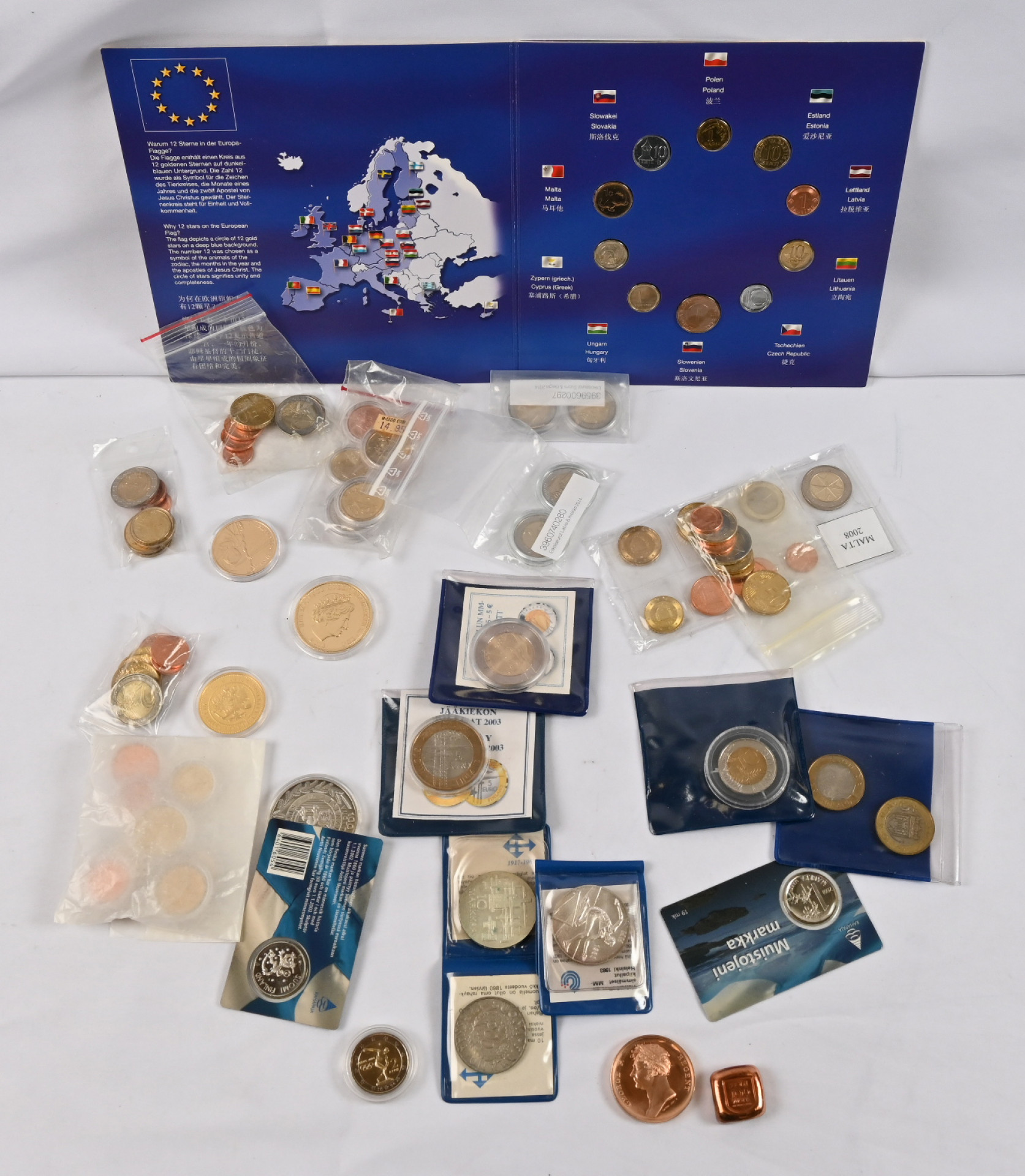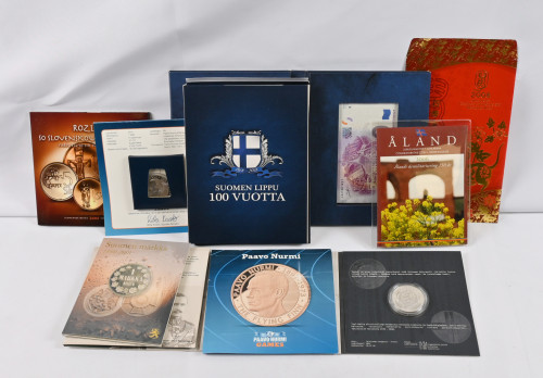 Sekalainen erä eurosarjoja, muita rahasarjoja, muutama hopeinen juhlaraha, Monetan ym. mitaleita ym. Myös kaksi 100% kuparilyöntiä, Waterloo-mitali ja Suomi 100 vuotta yhden unssin ”punnus”