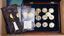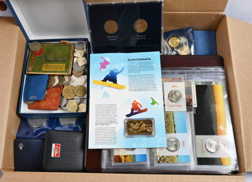 Sekalainen erä suomalaisia ja ulkomaisia kolikoita, Monetan tuotteita, juhlarahoja ym. 4,5 KG laatikossa
