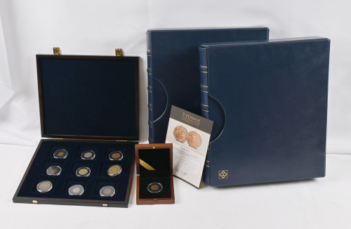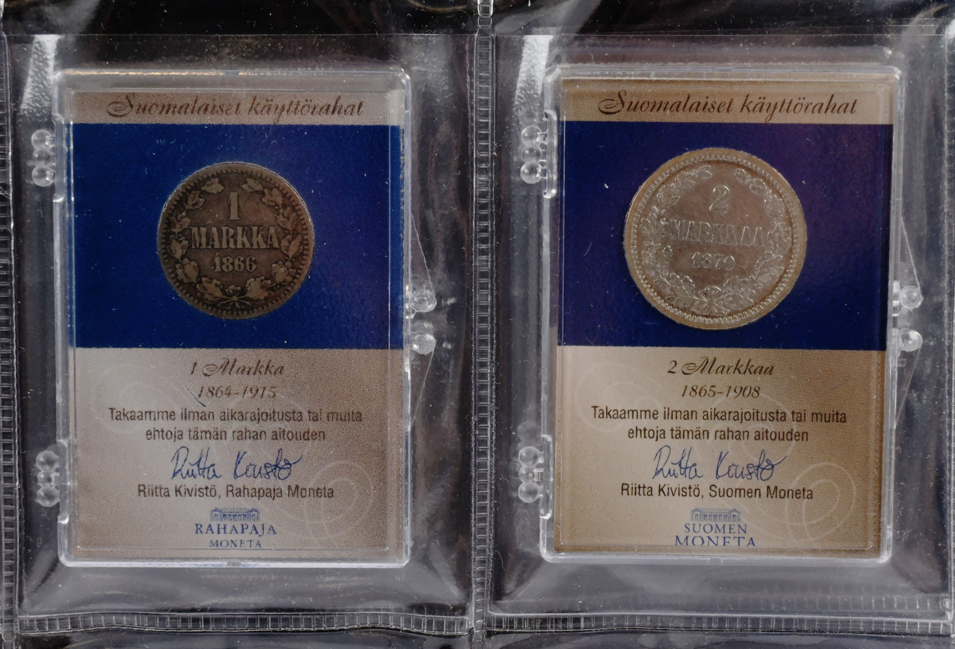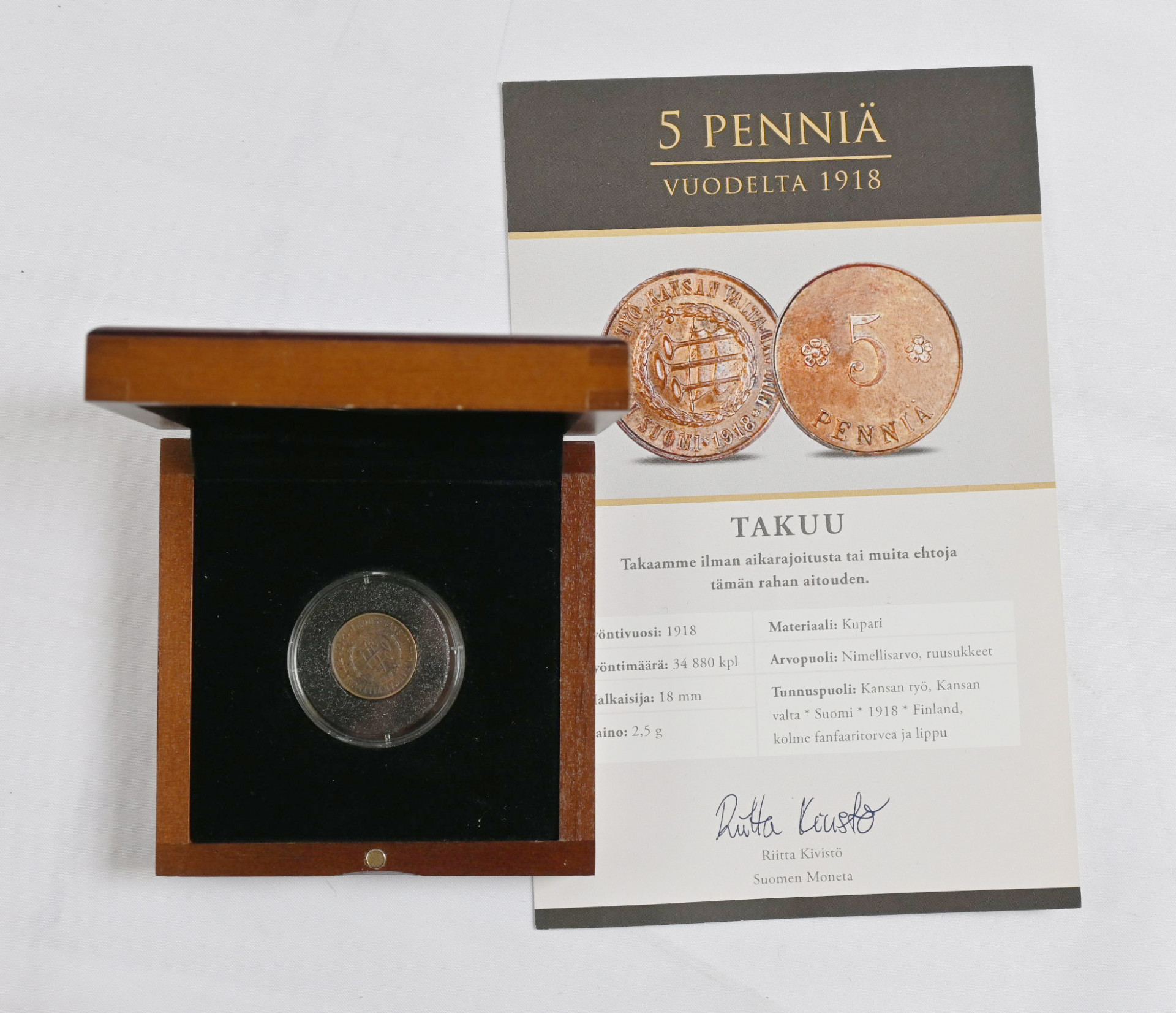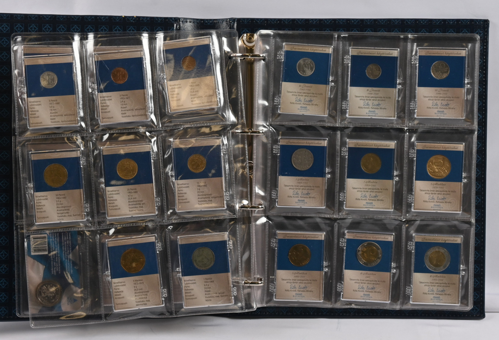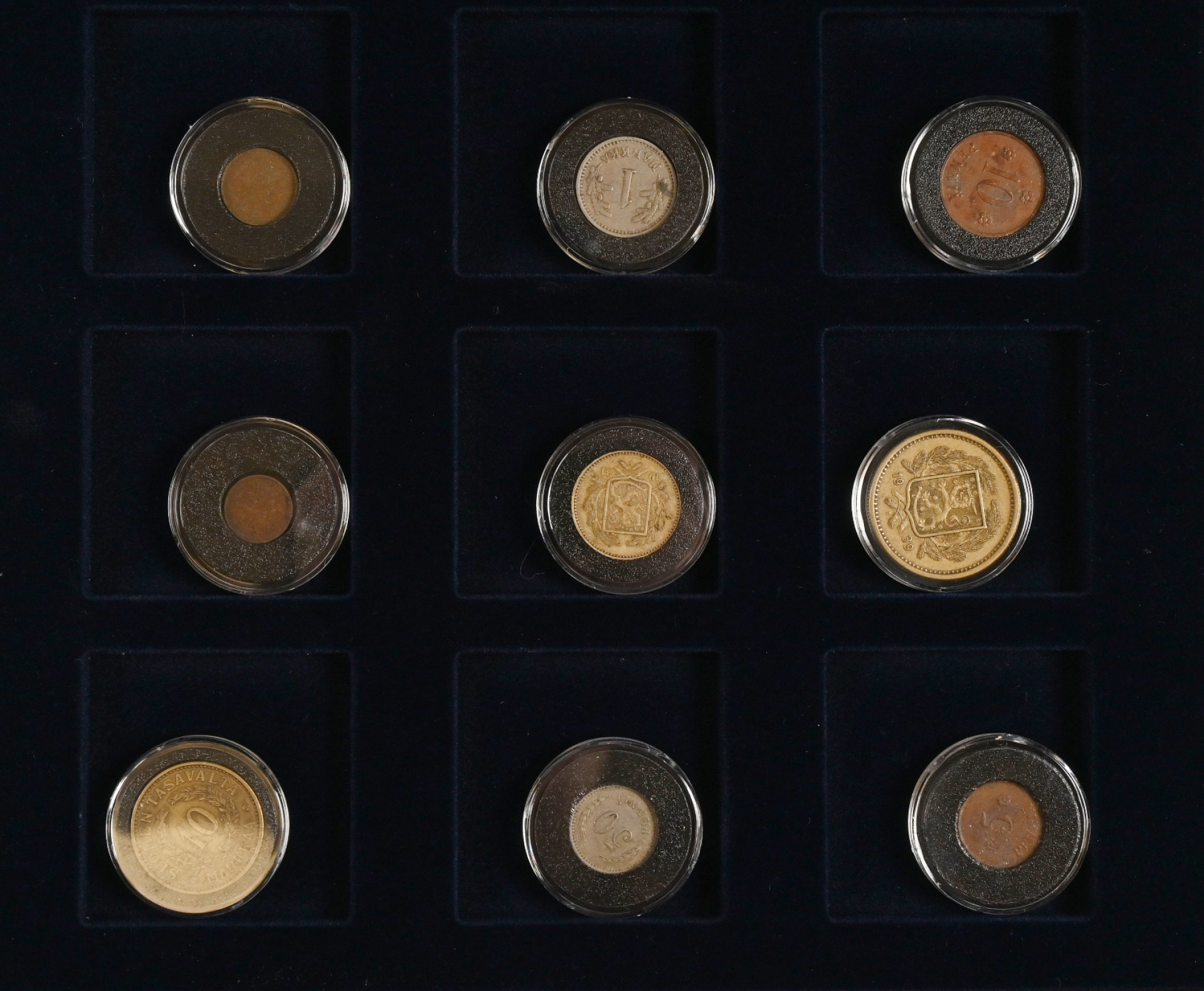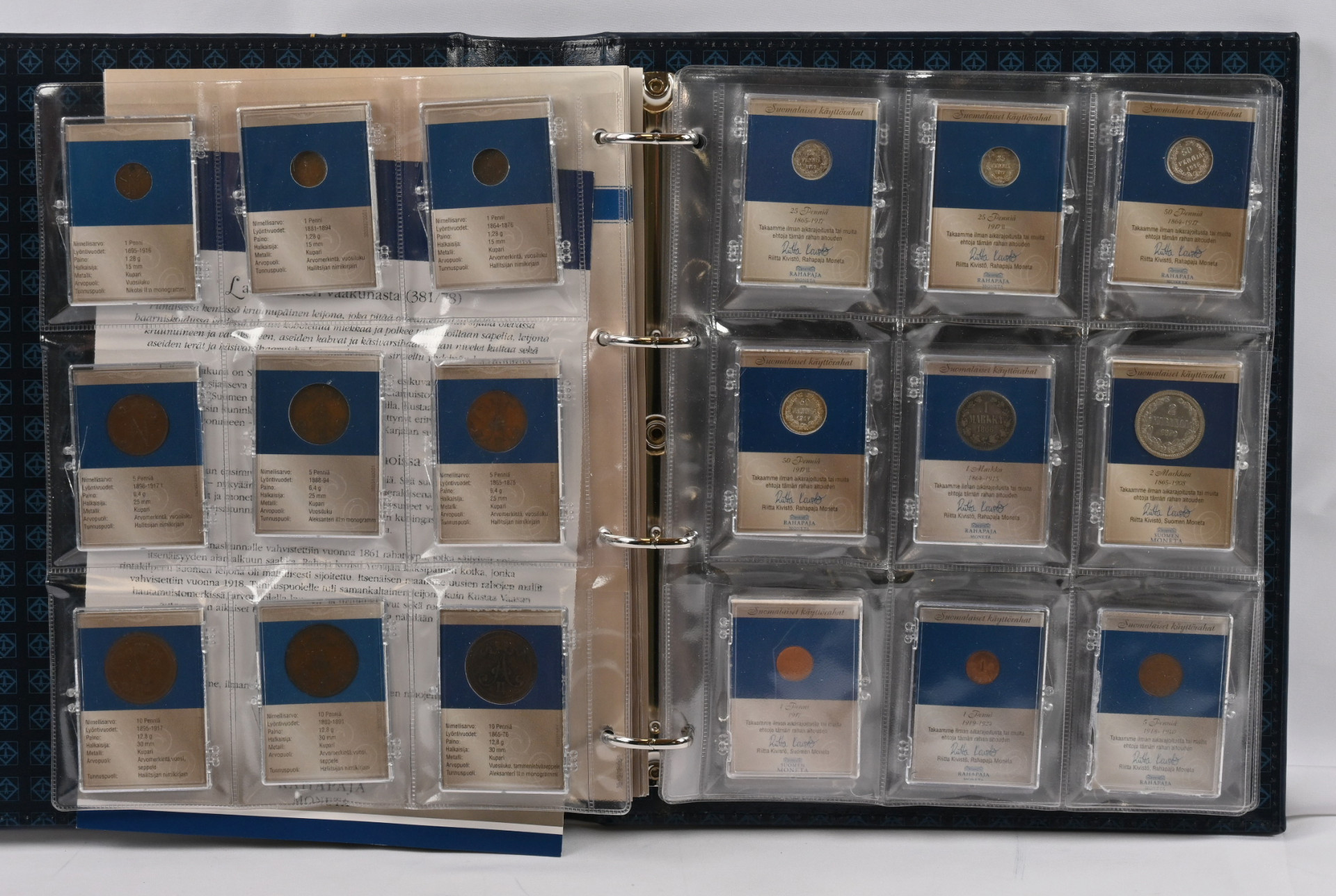 Suomalaiset käyttörahat kokoelma kahdessa hyvässä kansiossa. Useita hopearahoja ym. Lisäksi kokoelma ”Leijonarahat 1921-1939” laatikossa sekä 1918 5 penniä kansanvaltuuskunta (aitoustodistus).