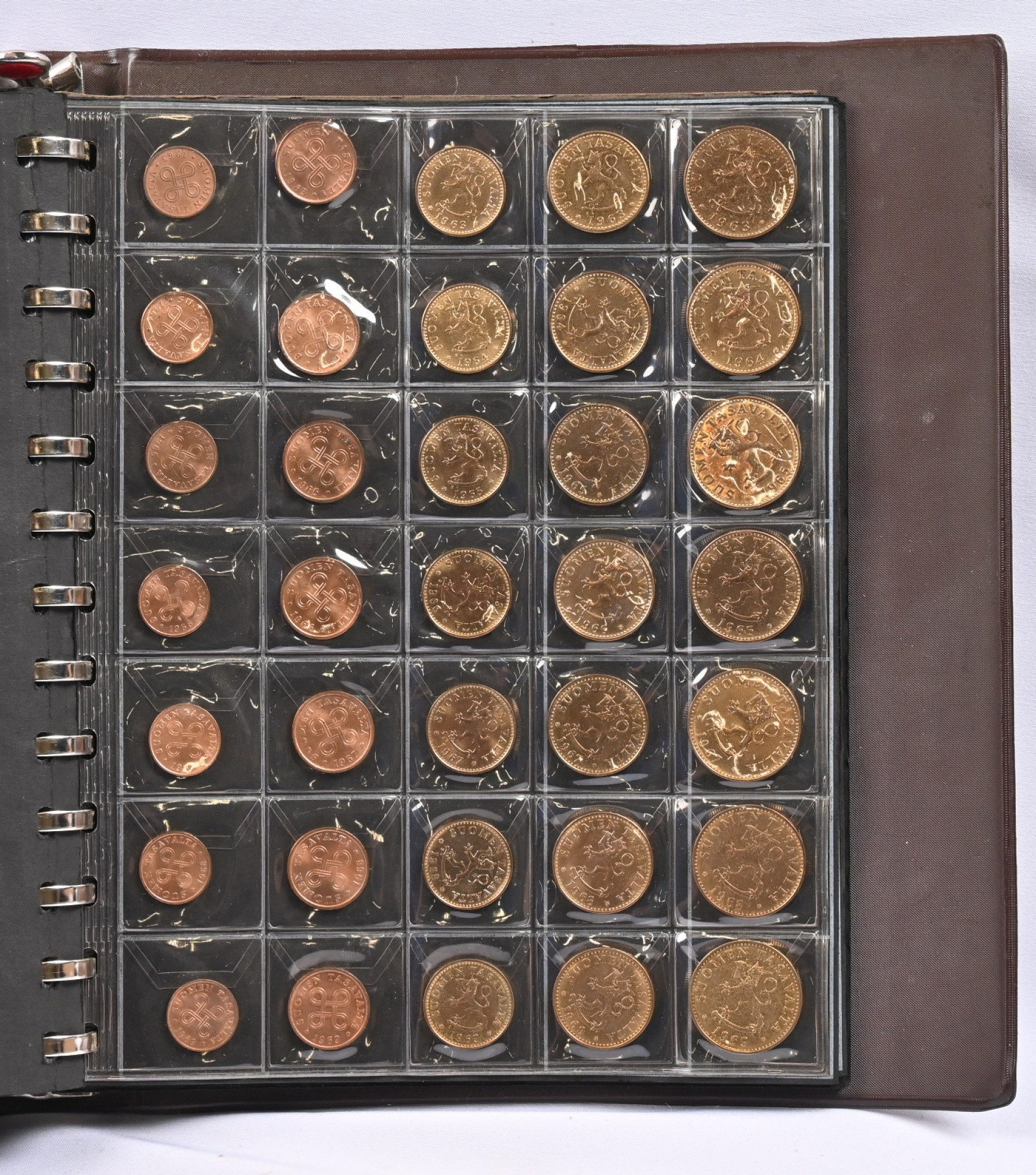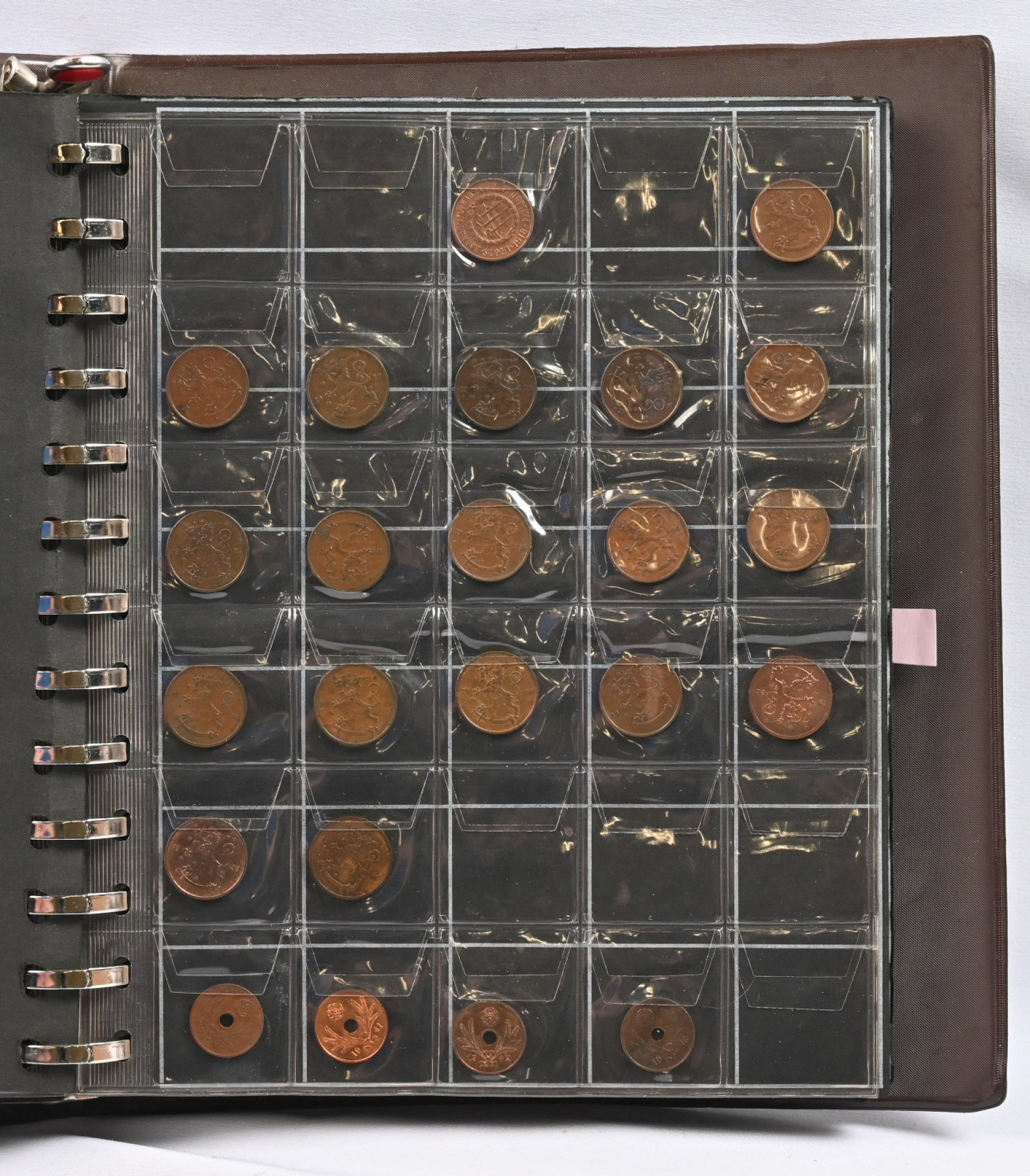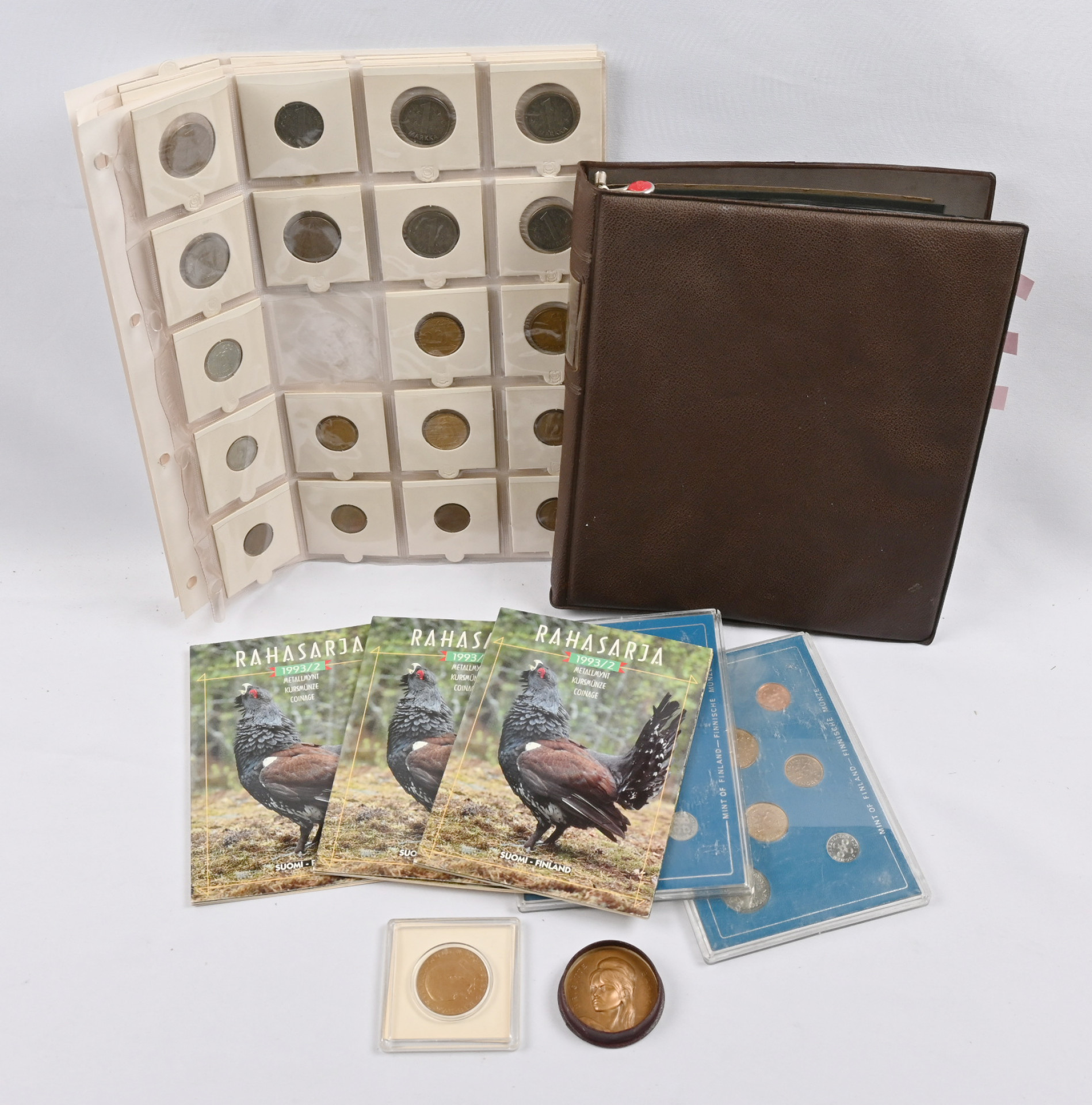 1866 alkaen pieni erä kolikoita kansiossa. Joitakin parempia, mm. 1918 5 penniä kv, hienolaatuisia 1963 sarjan rahoja, hopeamarkat 1964 - 69 UNC. Lisäksi kolmella sivulla muita rahoja, myös ulkomaisia sekä muutama kolikkosarja ja kaksi mitalia (Dag Hammarskjöld ja Brigitte Pardot).