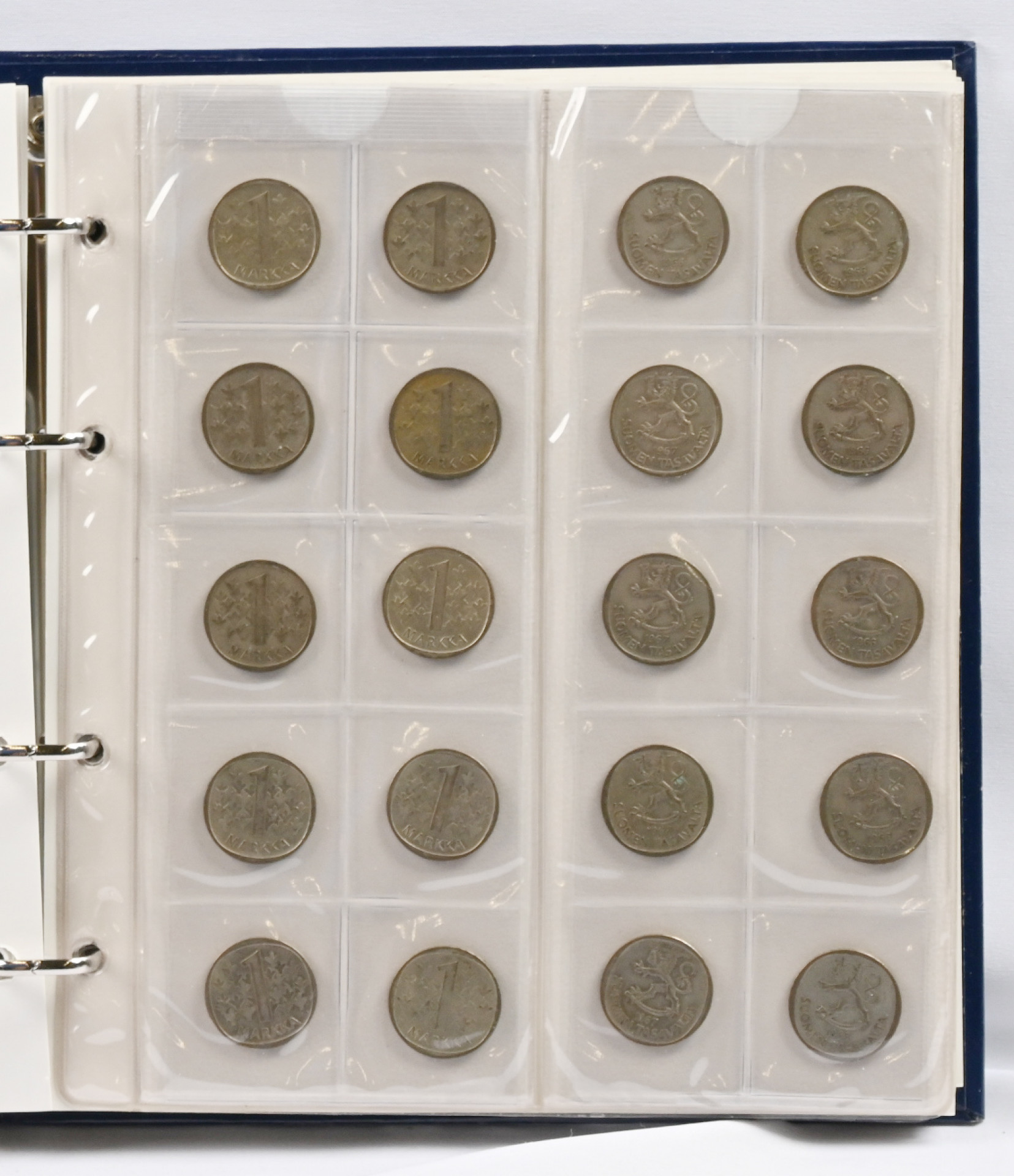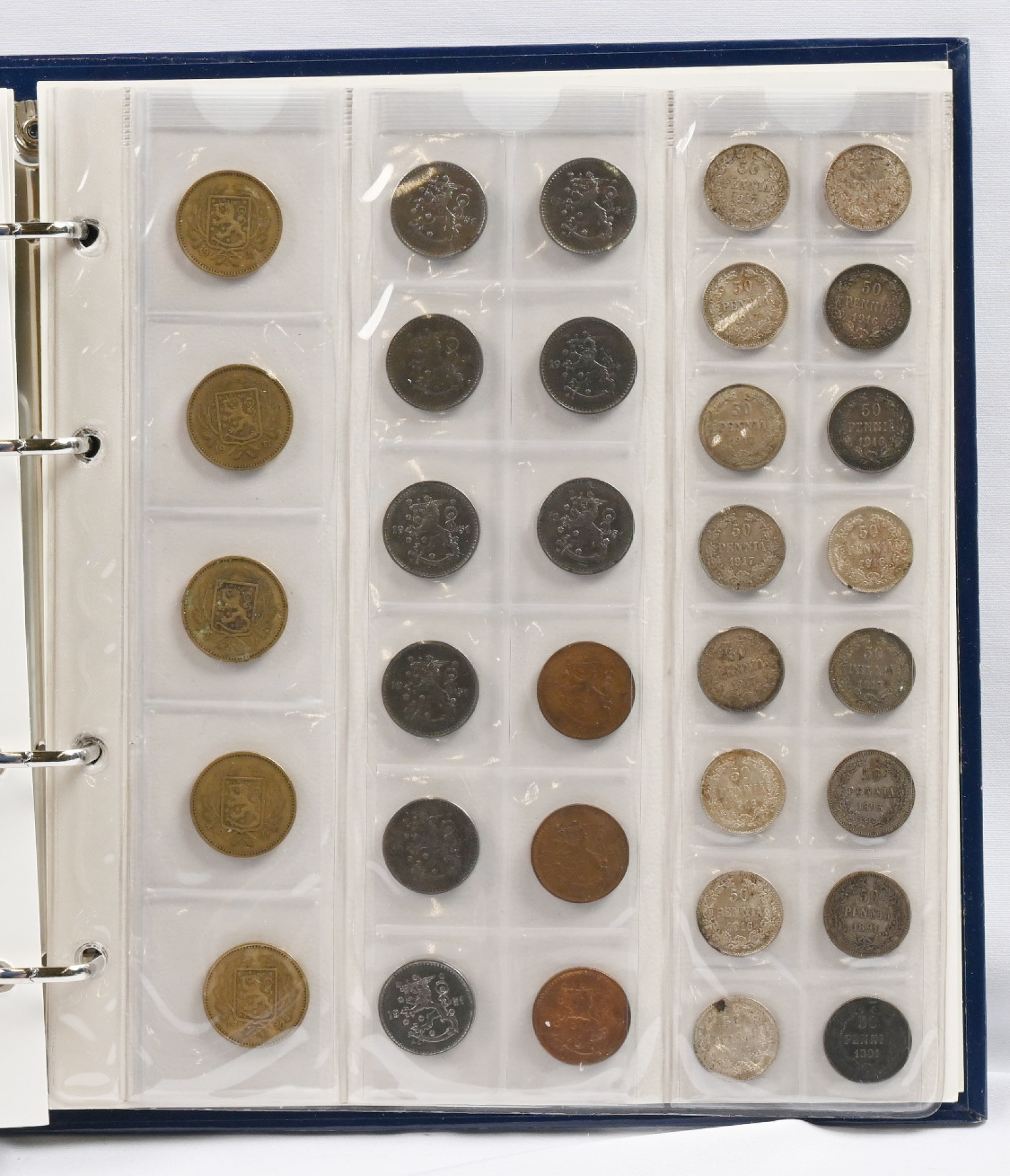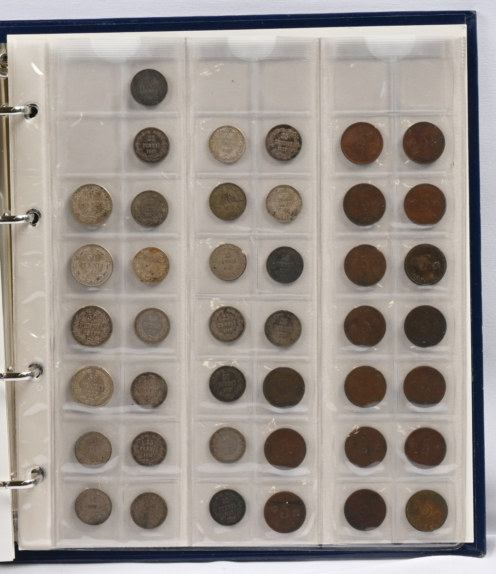 1890-luvulta alkaen pieni erä kolikoita kansiossa. Mm. yli 40 kappaletta hopeamarkkoja 1964-68, 40 tsaarinajan hopearahaa (25 penniä / 50 penniä) ym