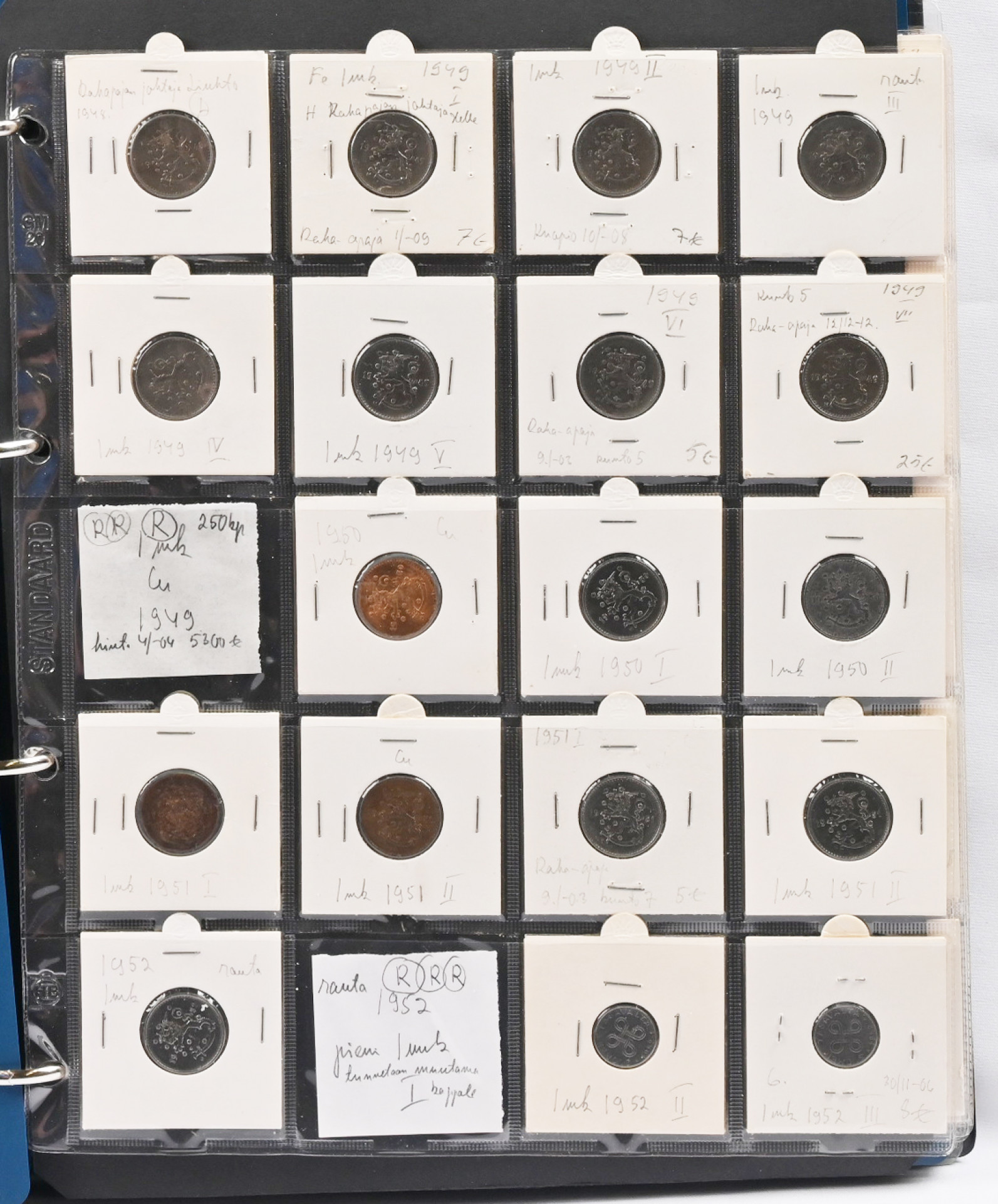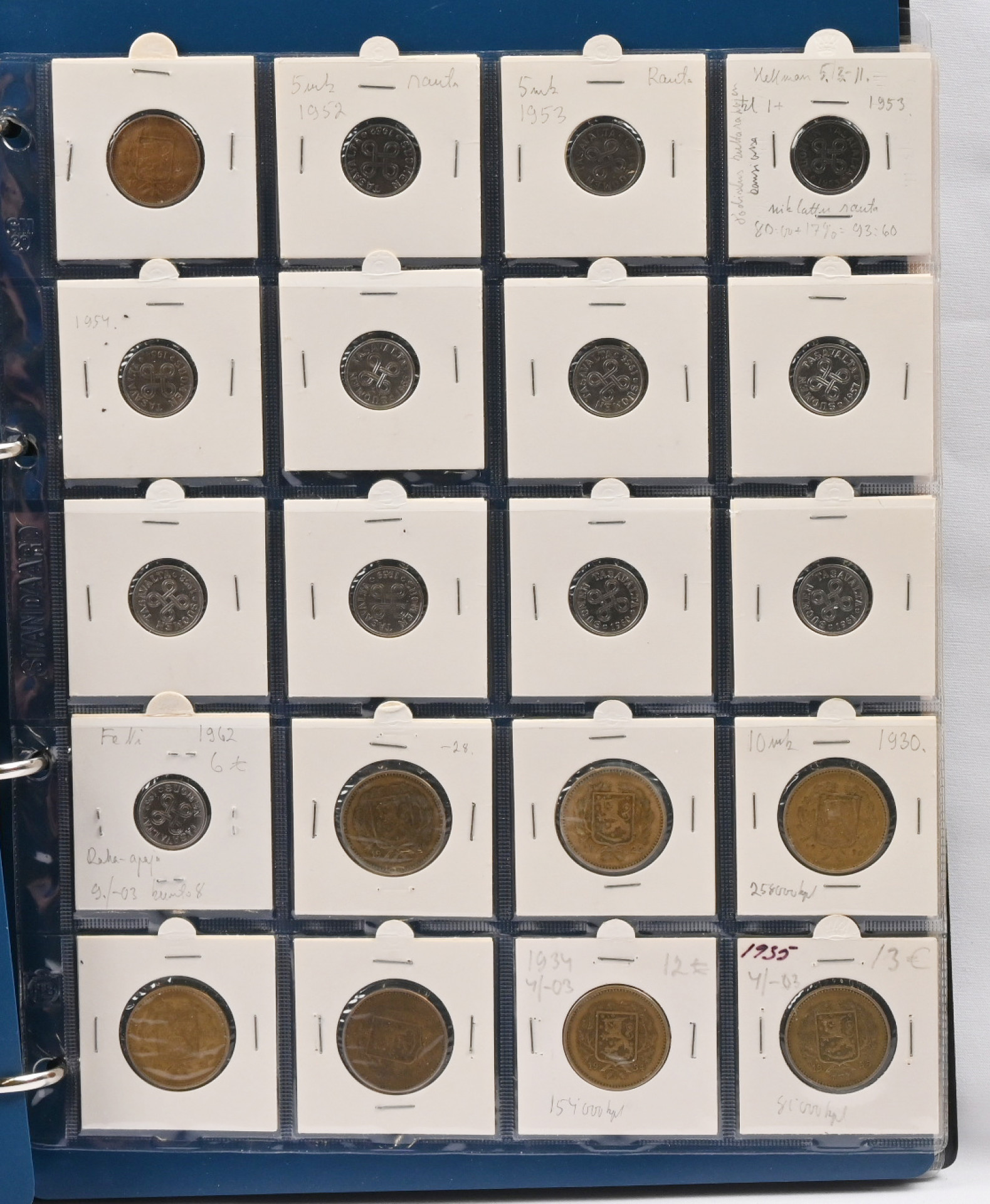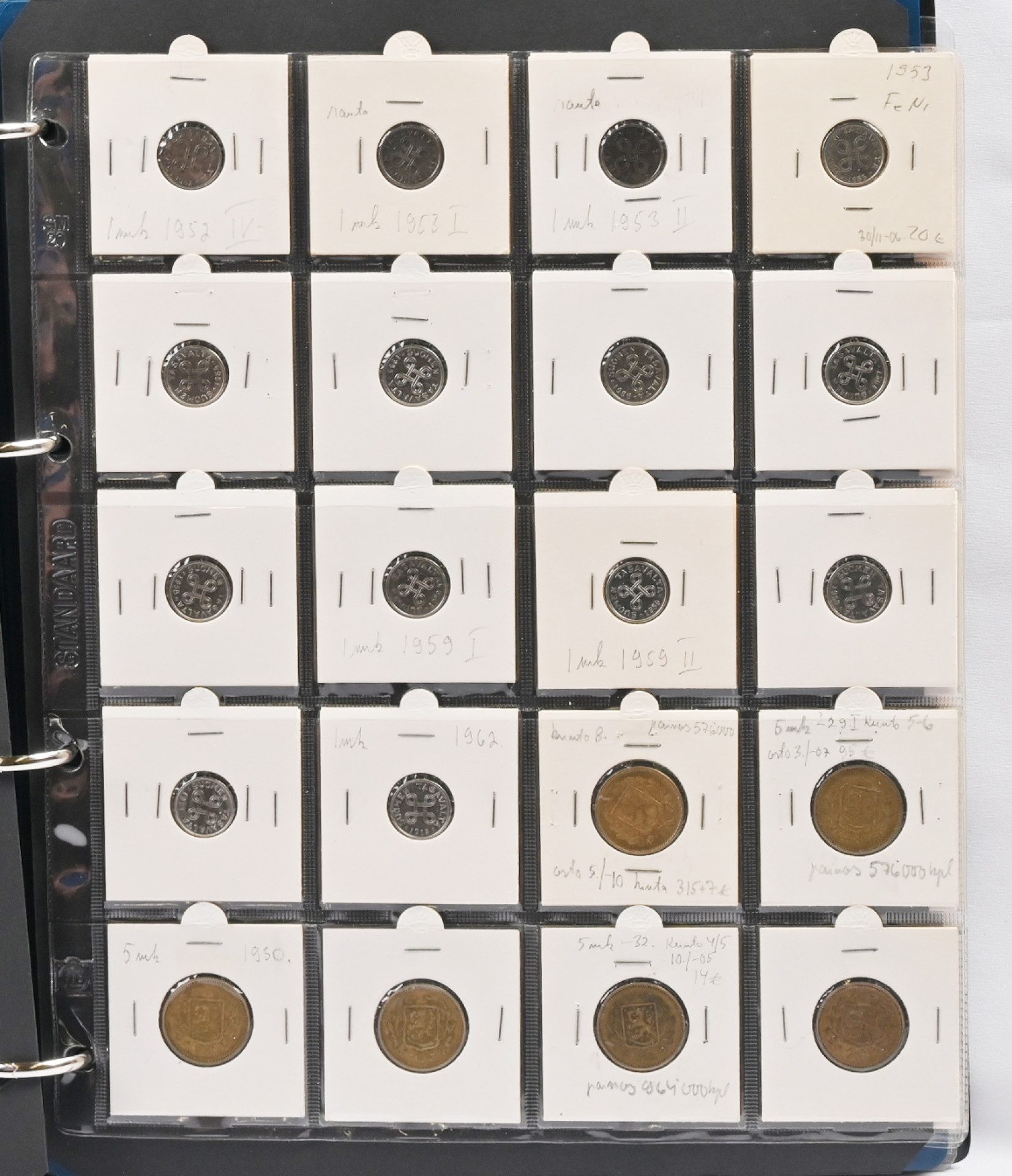 1917 - 1962 tasavallan kolikkokokoelma kansiossa. Hyvin täydellinen, puuttuu vain kultarahat ja neljä muuta kolikkoa (1917 5 penniä kv. II, 1949 1mk kuparia, 1950 1 markka rauta I ja 1958 200 markkaa S). Erittäin hyvä yleislaatu, monia todella hienoja (kl. 01 / 1+) parempiakin rahoja, mm. 1931 20 markkaa, 1958 50 markkaa, 1959 200 markkaa S, 1951 500 markkaa, 1960 1000 markkaa. Runsaasti varianttejakin