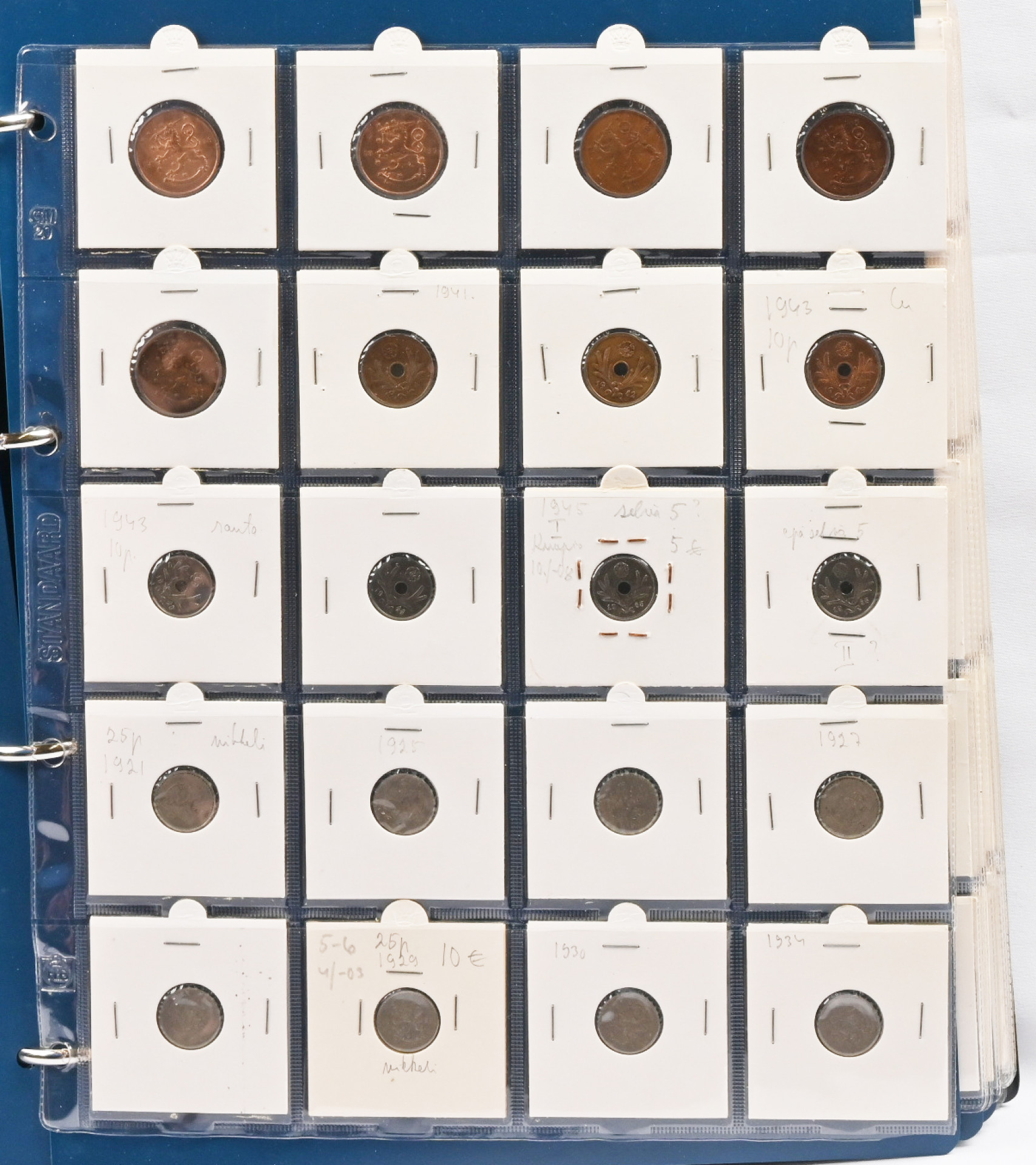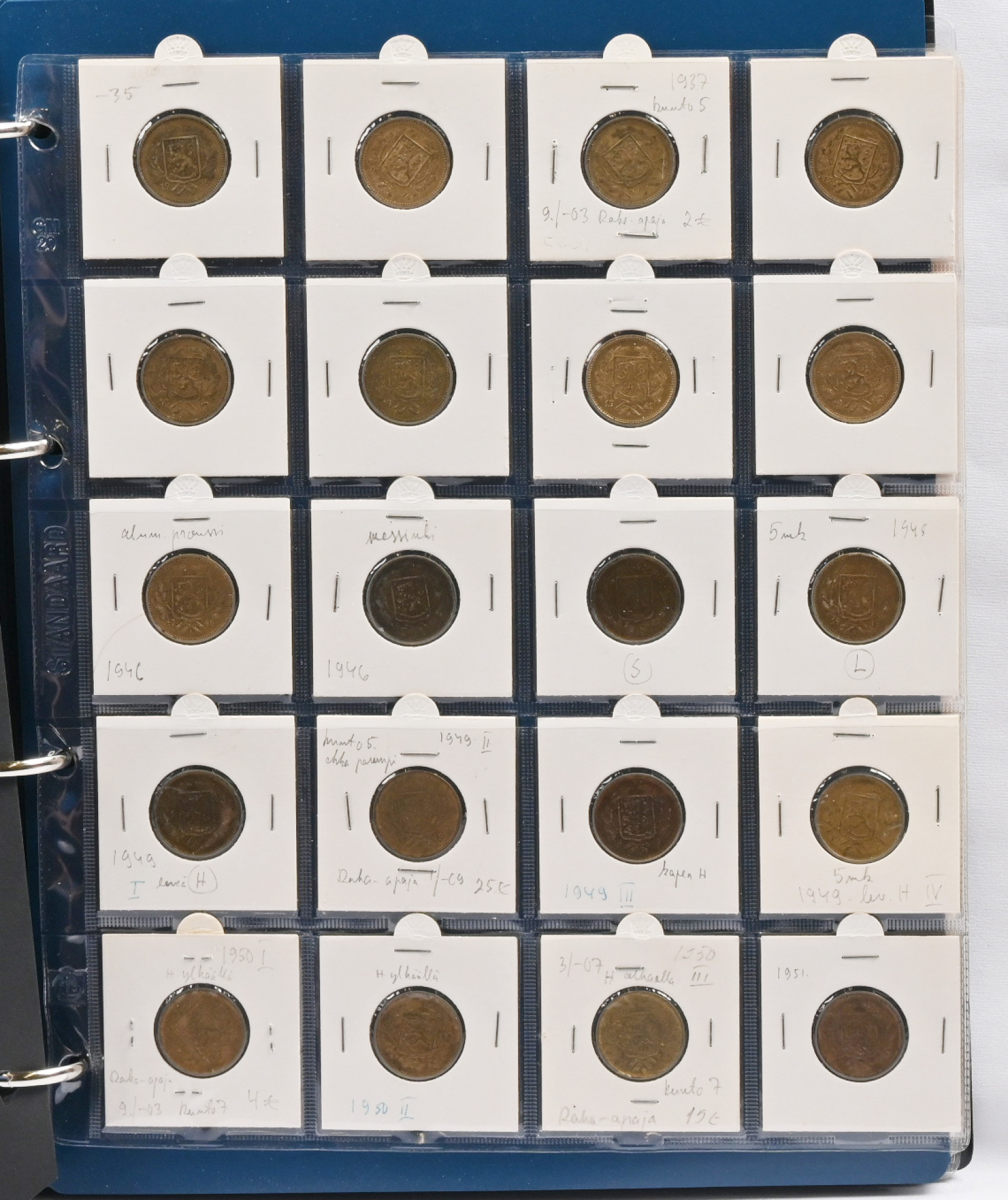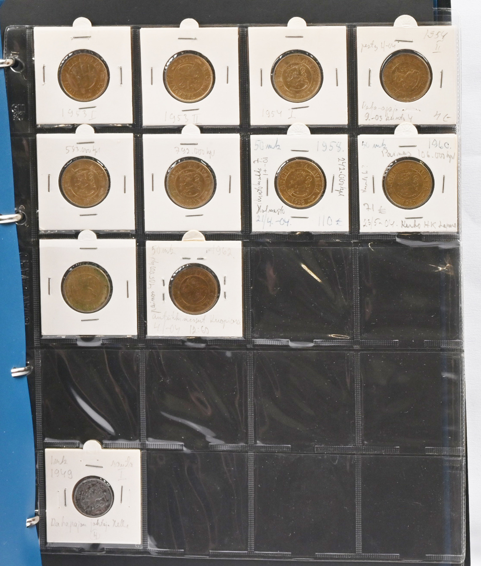 1917 - 1962 tasavallan kolikkokokoelma kansiossa. Hyvin täydellinen, puuttuu vain kultarahat ja neljä muuta kolikkoa (1917 5 penniä kv. II, 1949 1mk kuparia, 1950 1 markka rauta I ja 1958 200 markkaa S). Erittäin hyvä yleislaatu, monia todella hienoja (kl. 01 / 1+) parempiakin rahoja, mm. 1931 20 markkaa, 1958 50 markkaa, 1959 200 markkaa S, 1951 500 markkaa, 1960 1000 markkaa. Runsaasti varianttejakin