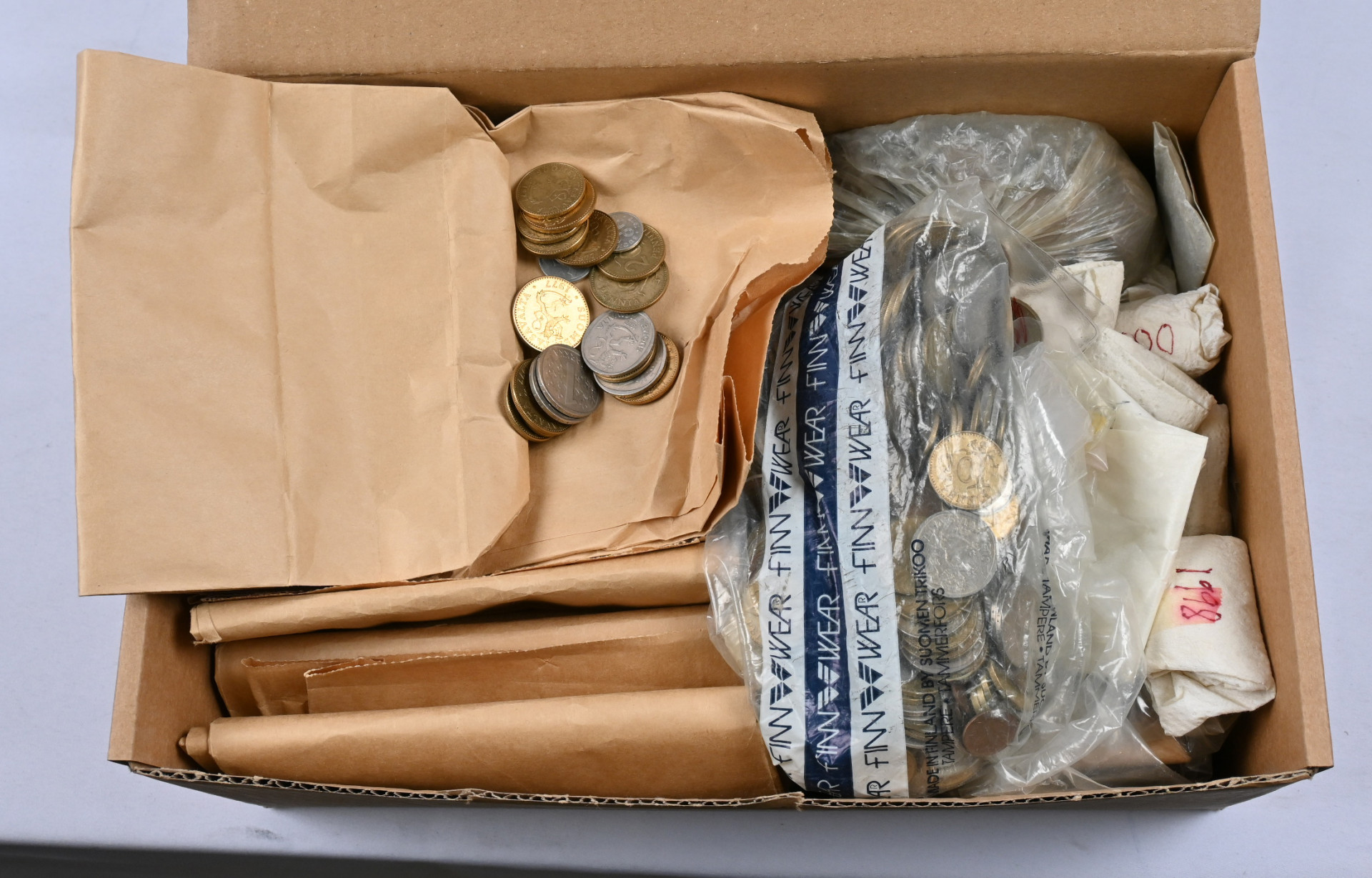 1950-luvulta markka-ajan loppuun iso erä kolikoita pusseihin, rulliin ja kääreisiin pakattuna yli 8 KG laatikossa.