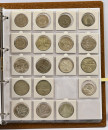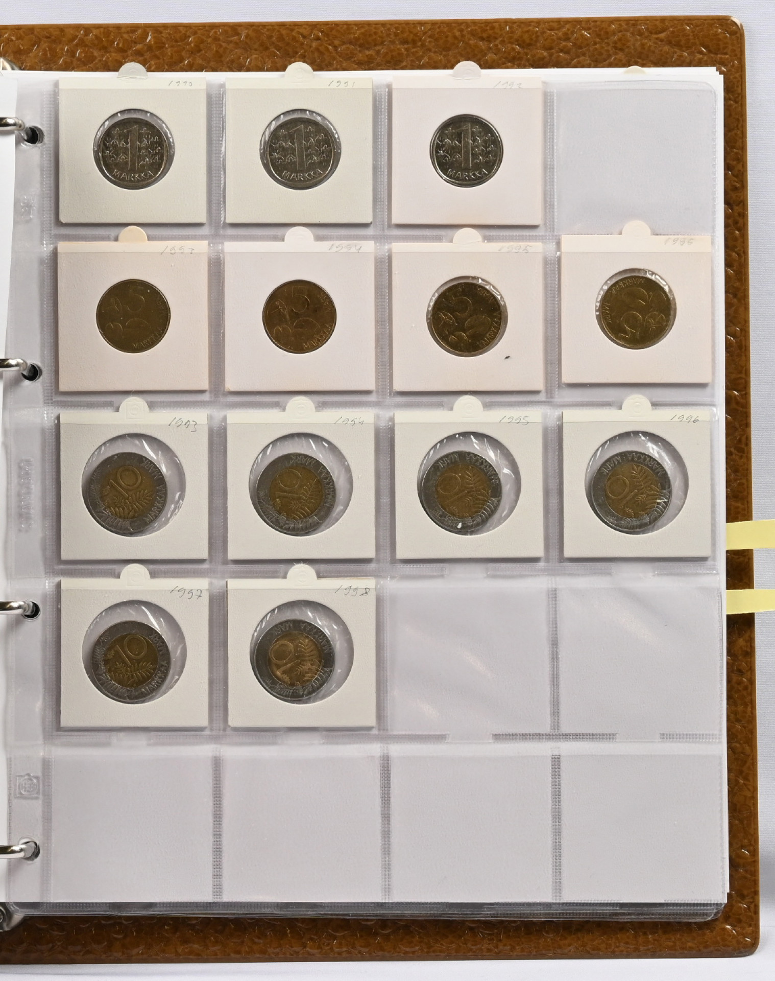 1 penni - 500 markkaa kolikoiden kokoelma kansiossa. Niukasti vanhaa, pääasiassa tasavallan aikaisia kolikoita. Mm 26 kappaletta hopeisia juhlarahoja