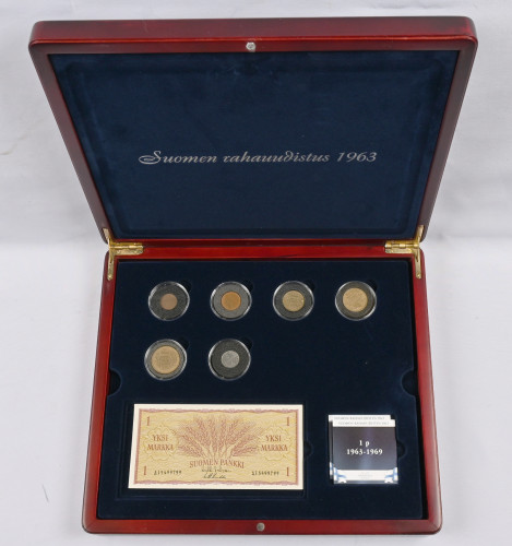 Monetan Suomen rahanuudistus 1963 kokoelma laatikossa ja kansiossa raha- ja mitalikirjeitä kahdeksan erilaista