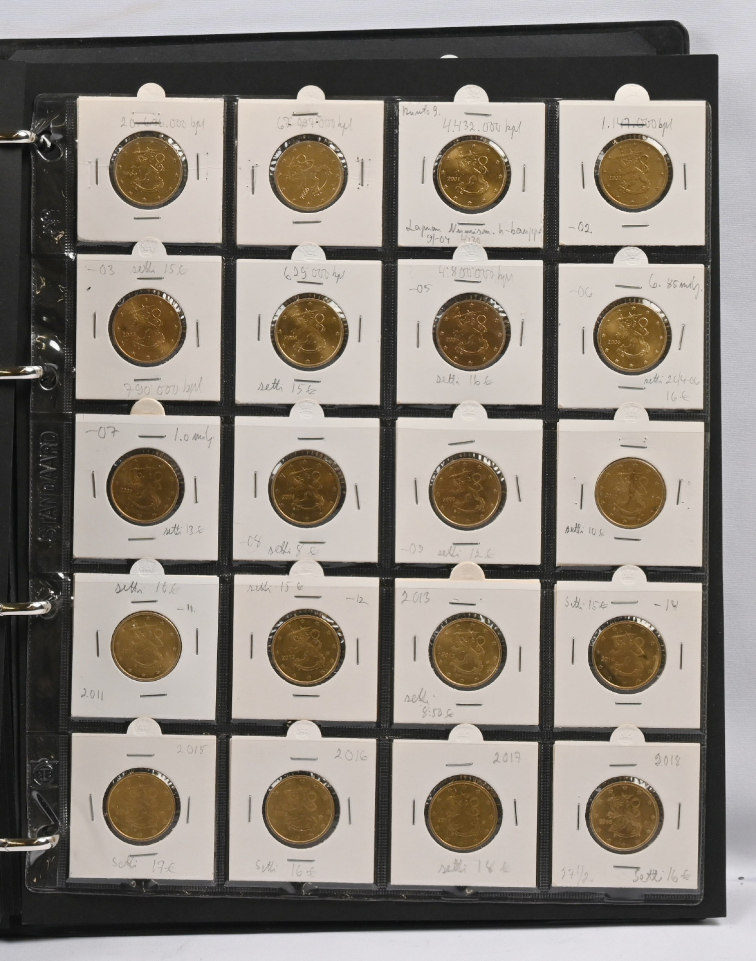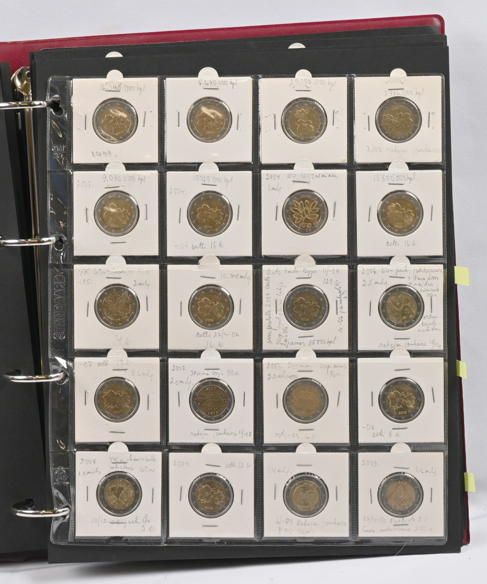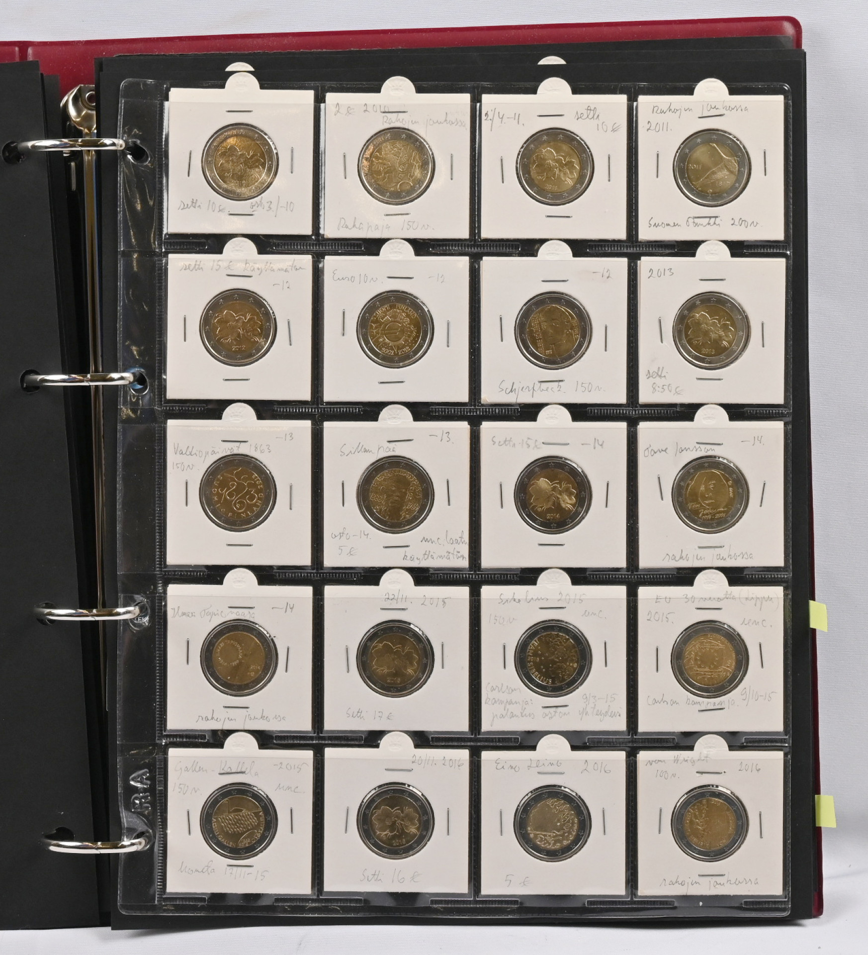 1999 - 2020 Suomen eurokolikot 1c - 2€ kahdessa kansiossa (vuosi 2019 puuttuu). Mukana kaikki 2€ erikoislyönnit, kaikkiaan 60 kappaletta 2€ kolikoita. Lisäksi 9 kappaletta 5€ rahoja + muutama variantti