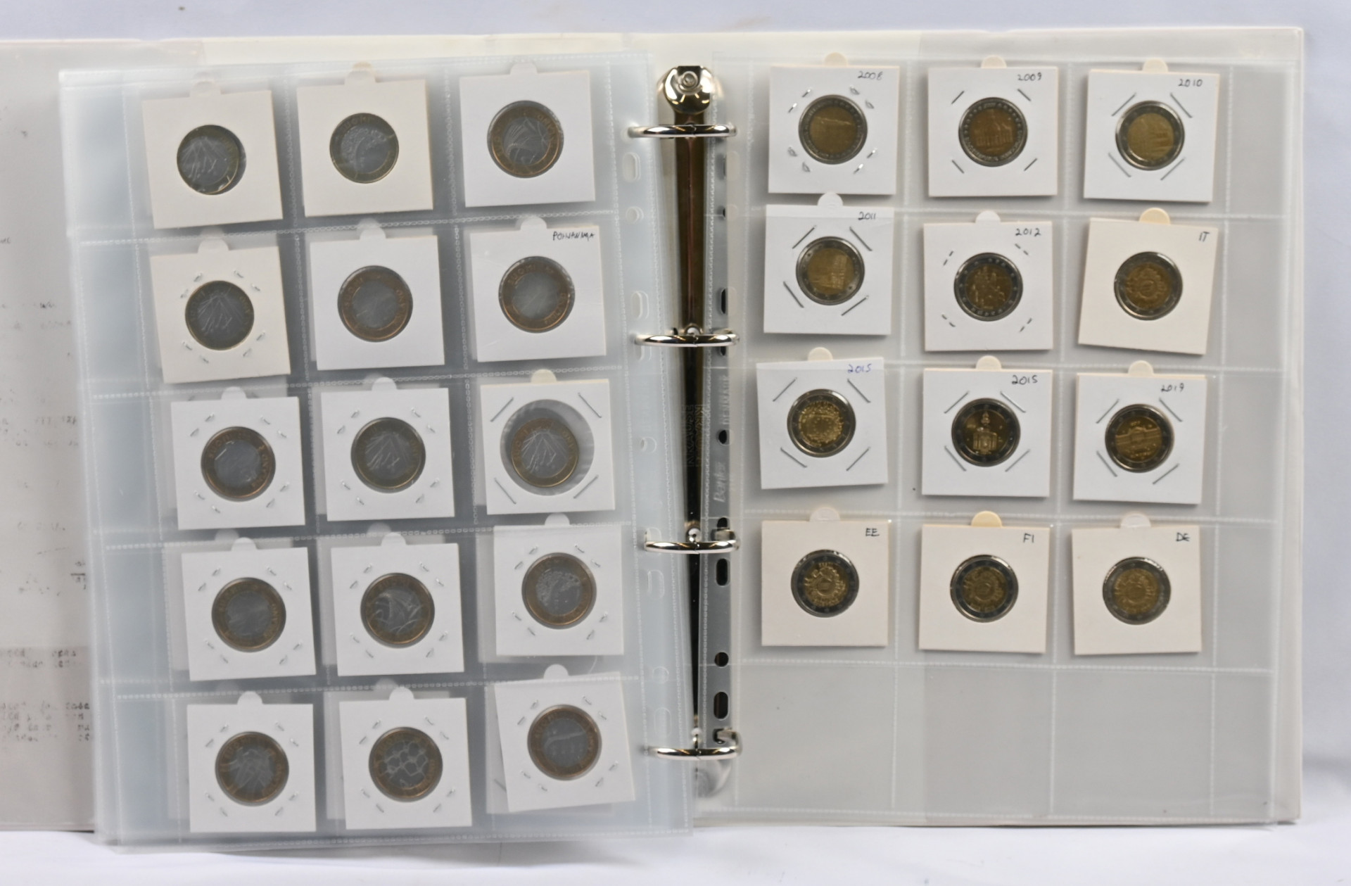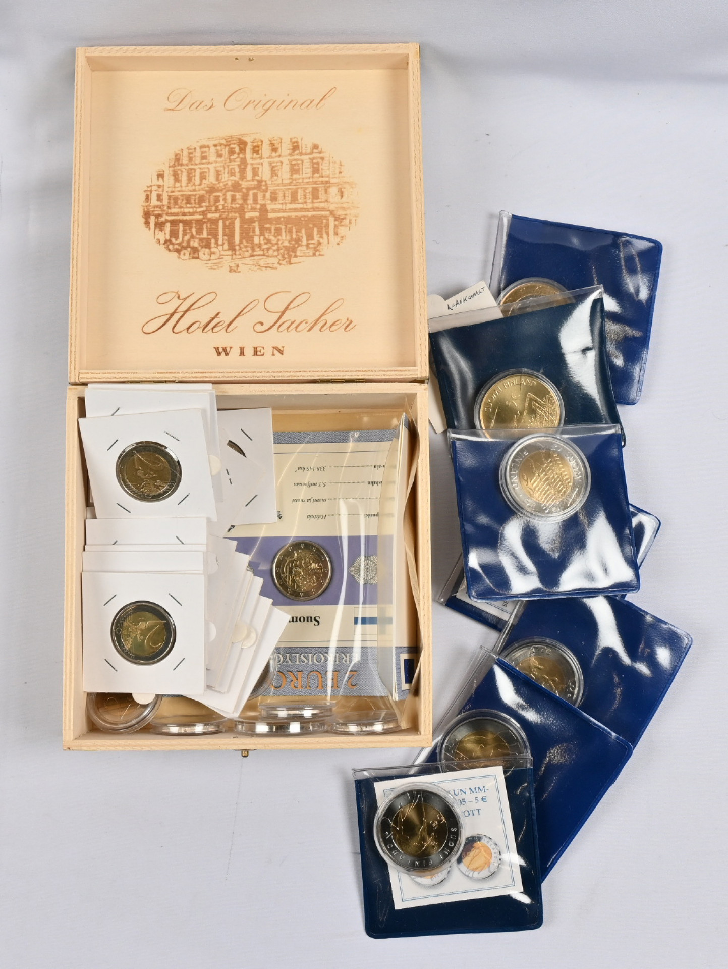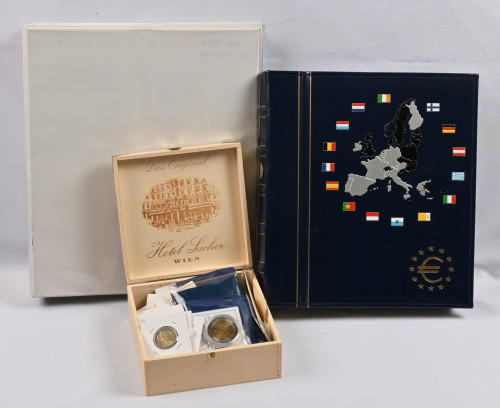 Eurokolikoiden (2€ ja 5€) hyvä kokoelma / erä kansiossa ja laatikossa. Yli 140 kappaletta 2€ (mm. 1 kappale väärä kartta ja viisi ”risurahaa”) ja 26 kappaletta 5€. Lisäksi Leuchtturmin eurokolikkokansi