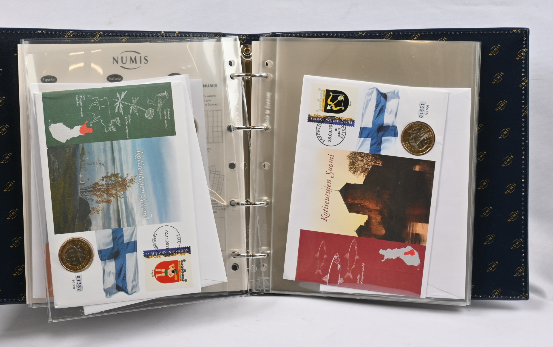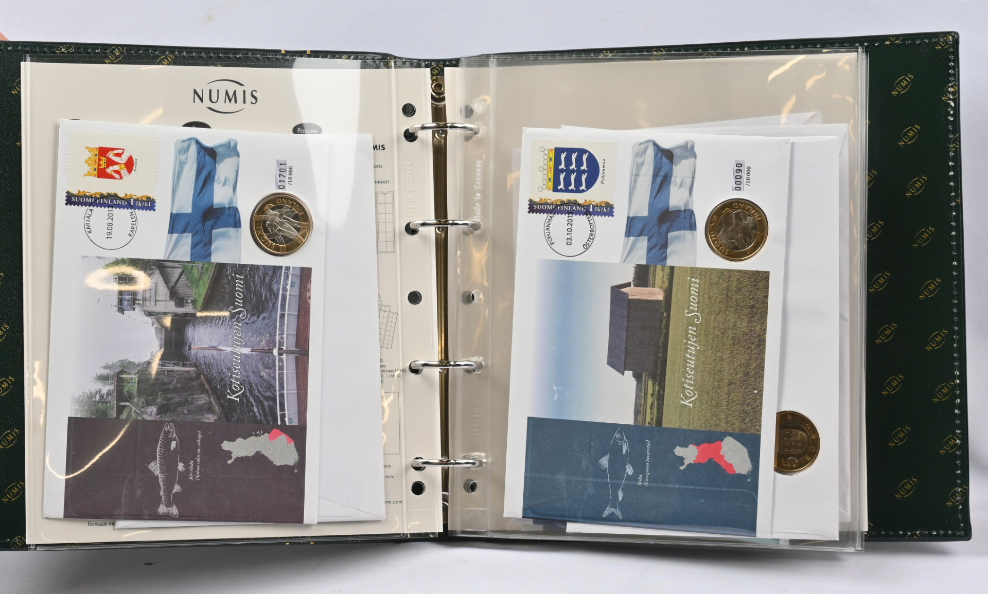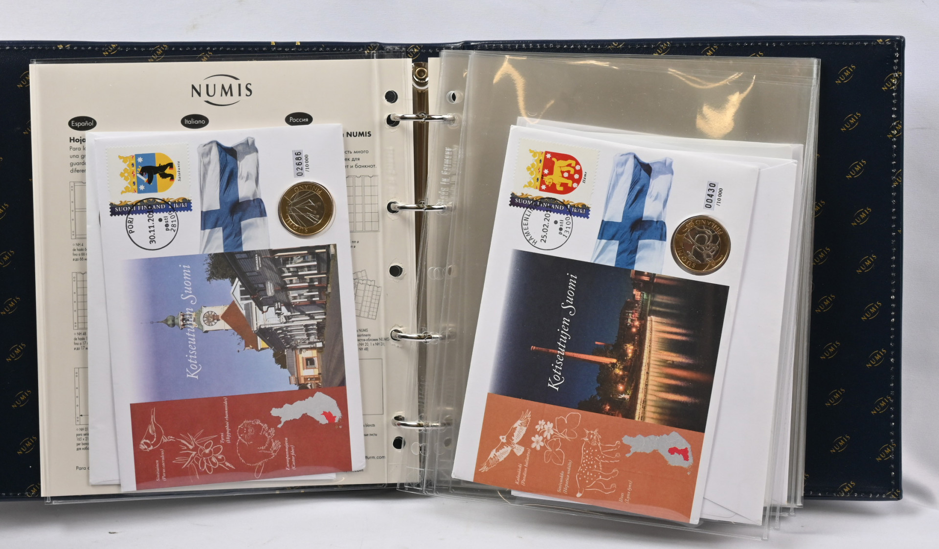Kotiseutujen Suomi rahakirjeitä kansiossa 17 kappaletta. Jokaisessa 5€ maakuntaraha ja maakunnan ikimerkki .