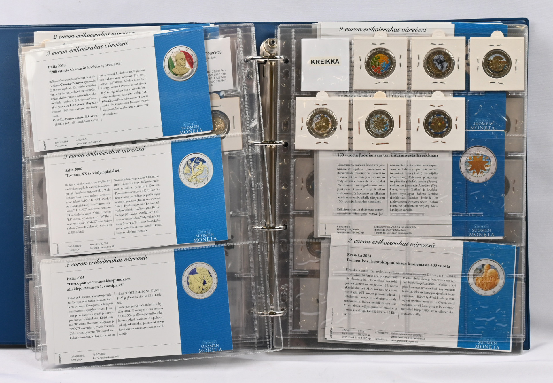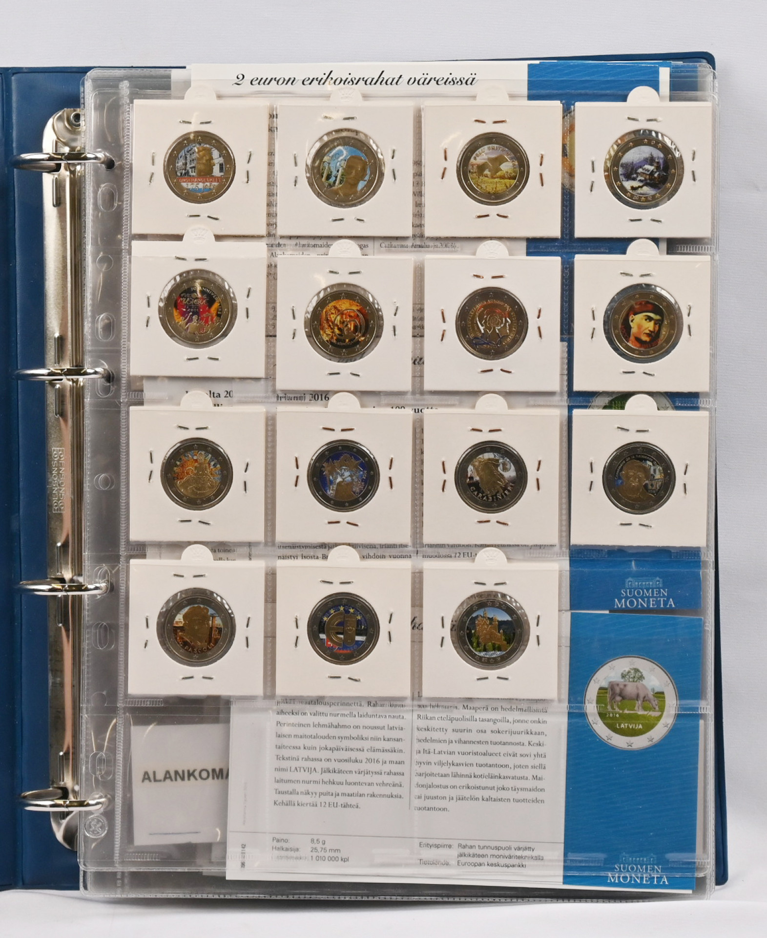 Upea värikäs kokoelma 2€ erikoiseuroja, jotka kaikki värjätty noin 90 erilaista eri euromaista! Mukana Monetan takuulaput. Huikean hieno kokonaisuus!