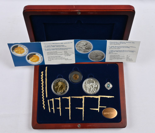 2005 20€ Yleisurheilun MM -kilpailut, kultaa osana MM2005 rahakokoelmaa, jossa kaksi juhlarahaa ym laatikossa