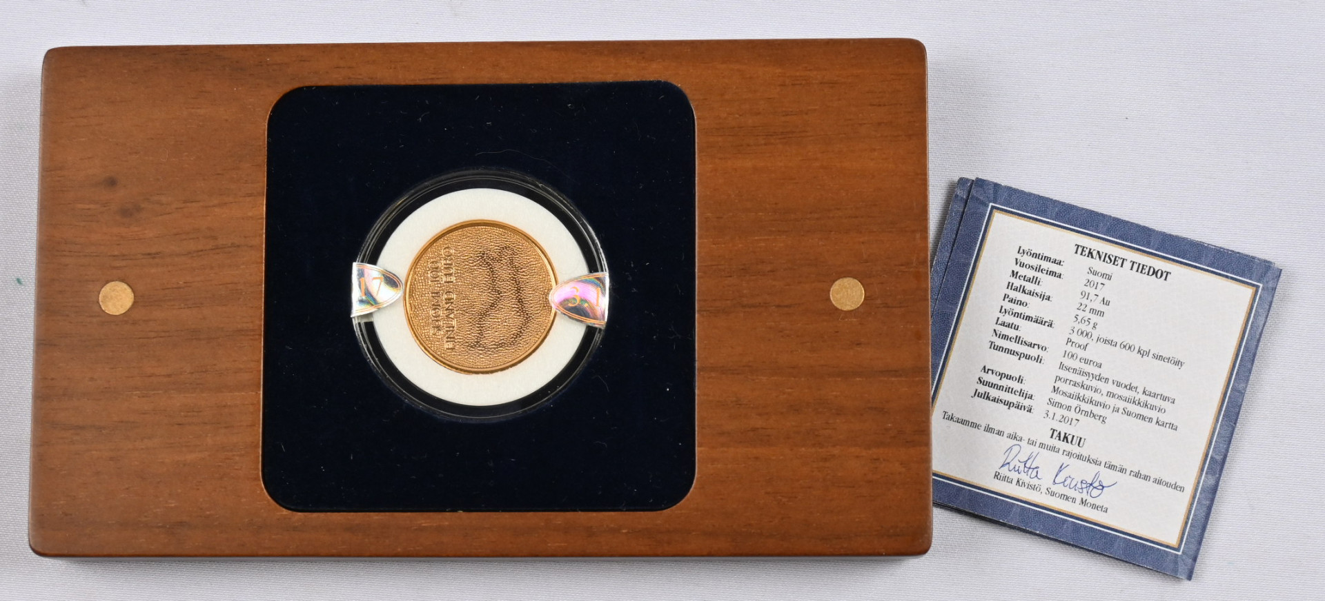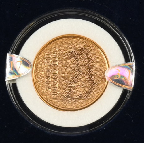 2017 100€ Itsenäinen Suomi 100-vuotta, kultaa Monetan paketissa takuun kera numeroitu