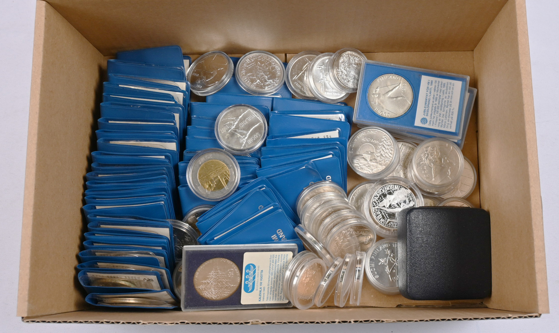 Hopeisia juhlarahoja hieno iso erä: 10 markkaa (28), 25 markkaa (16, muutama Cu-Ni), 50 markkaa (19) ja 100 markkaa (33). Yhteensä 96 kolikkoa