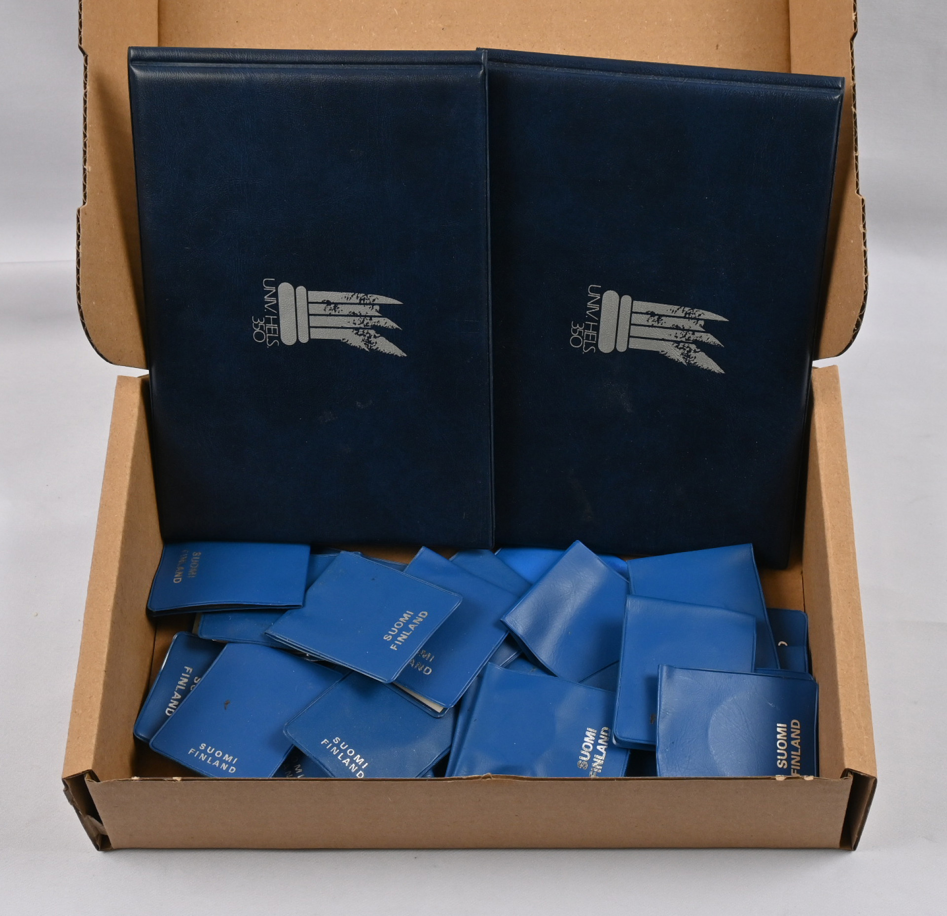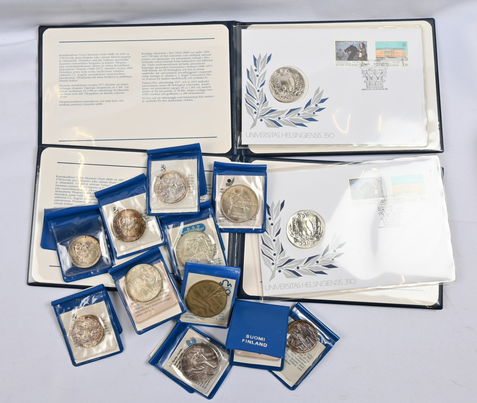 Juhlarahoja erä: 10 markkaa (13), 25 markkaa (3), 50 markkaa (8) ja 100 markkaa (2 rahakirjettä).