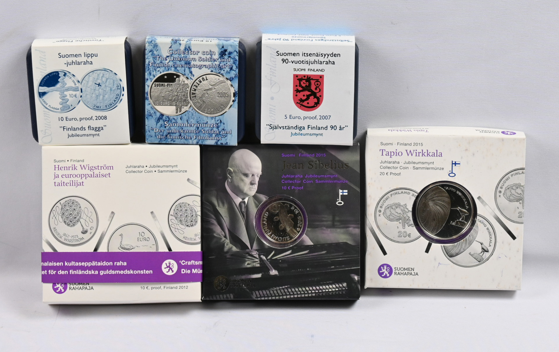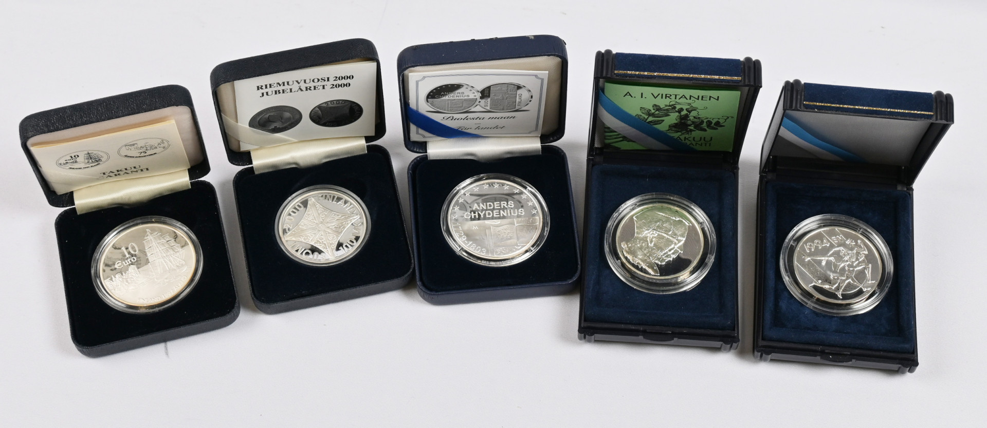 1994 - 2015 erä Proof-laatuisia hopearahoja aitoustodistuksin. 100 markkaa (3), 5 euroa (1), 10 euroa (6) ja 20 euroa (1).