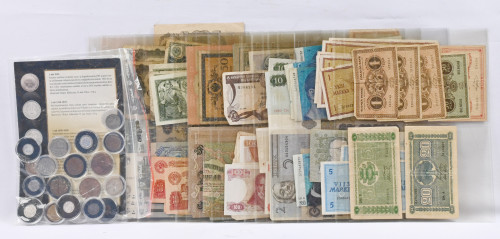 Sekalainen erä suomalaisia ja ulkomaisia seteleitä ja vähän suomalaisia kolikoita (Moneta). Vaihteleva kunto...