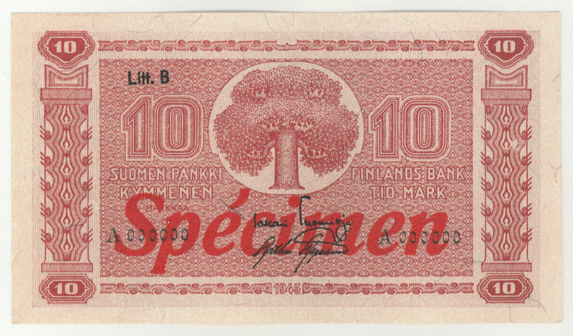 1945 10 markkaa Litt. B Spécimen -seteli! Kl 0