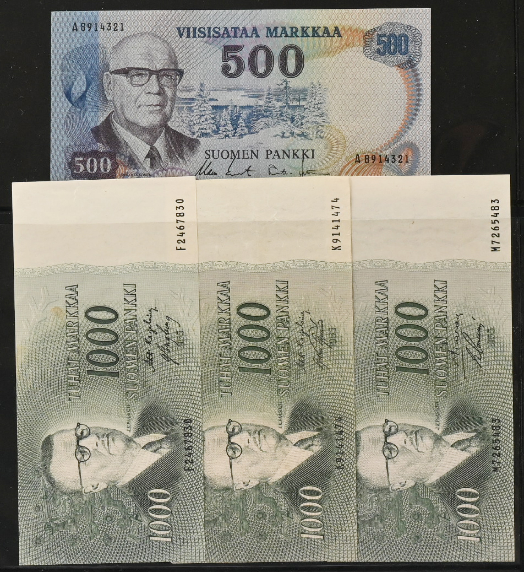 1955 - 1993 erä mm. 1955 1000 markkaa kolme kpl, 1975 500 markkaa ym