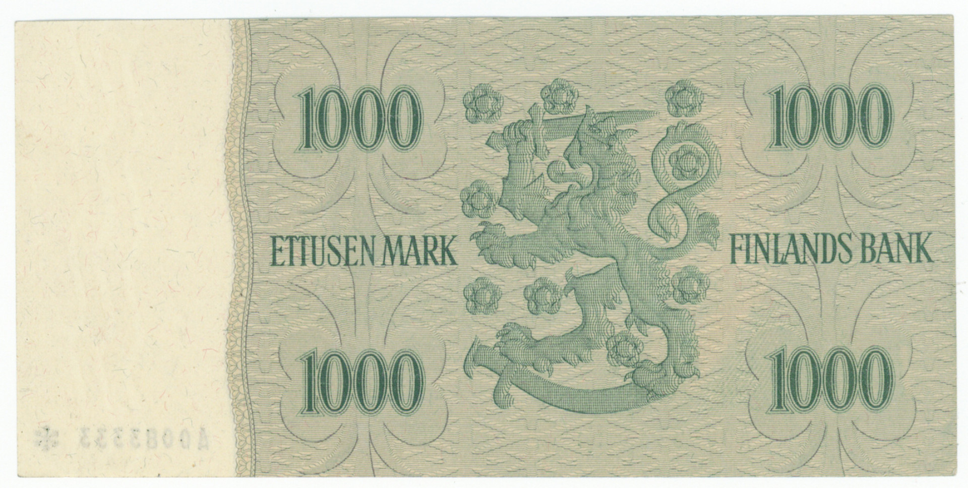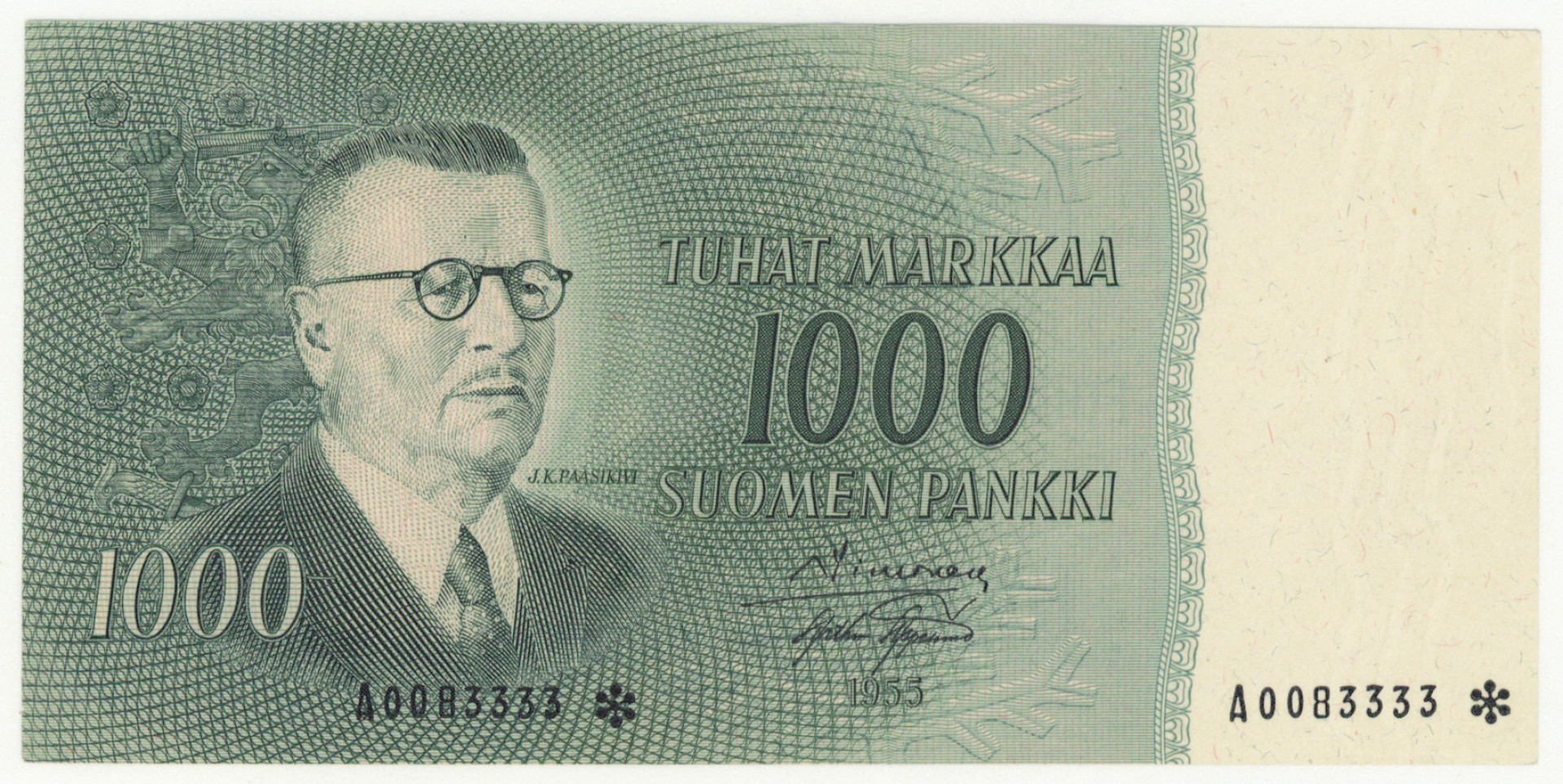 1955 1000 markkaa sarjanumero A0083333* kl 01