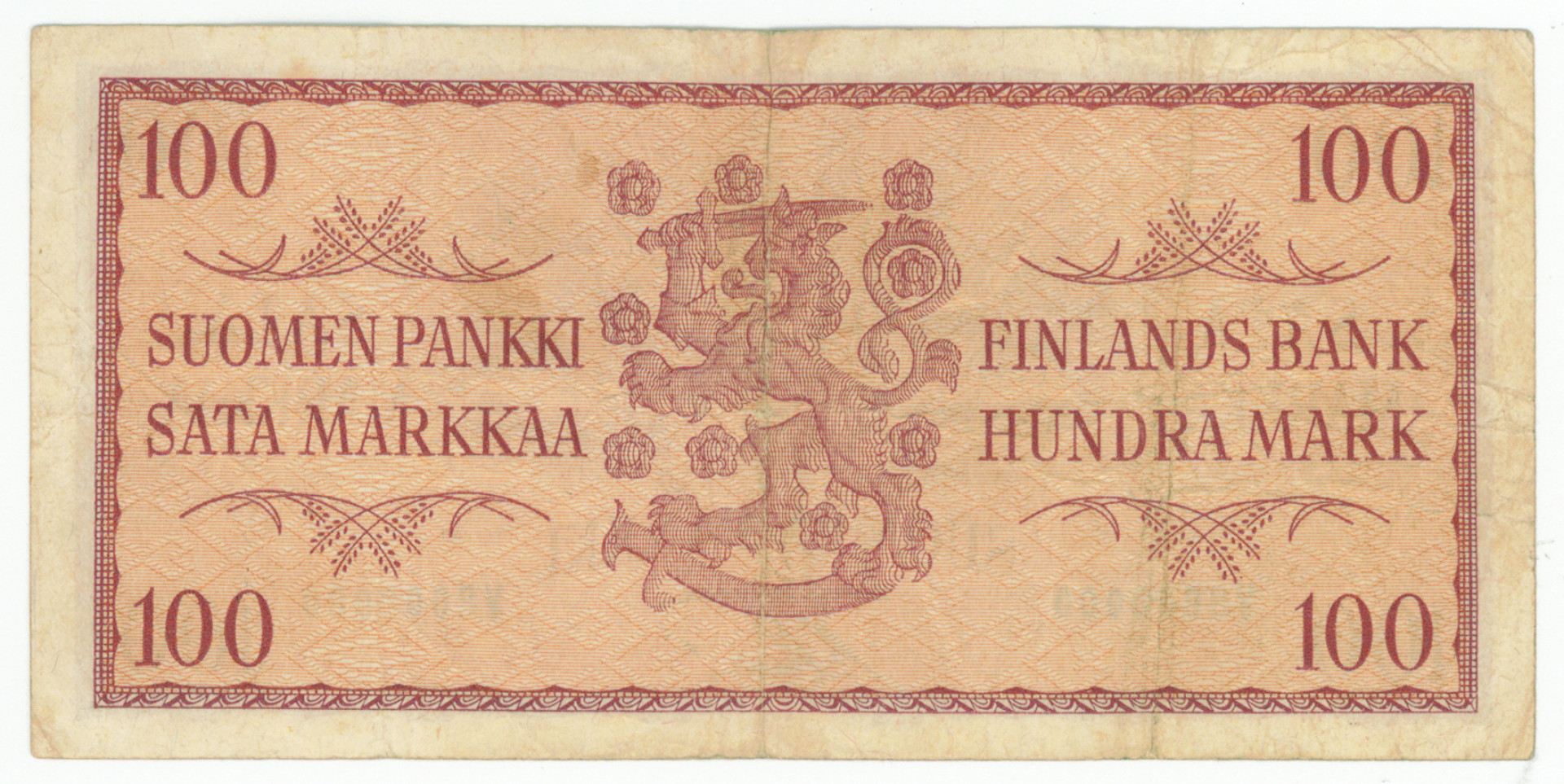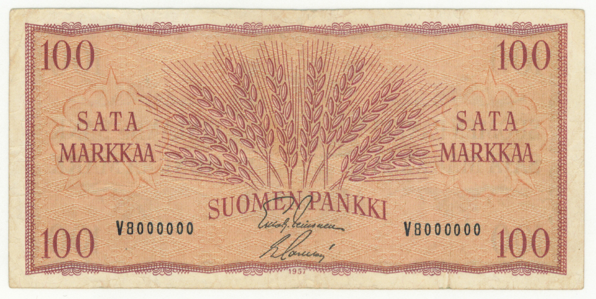 1957 100 markkaa sarjanumero V8000000, kl 1