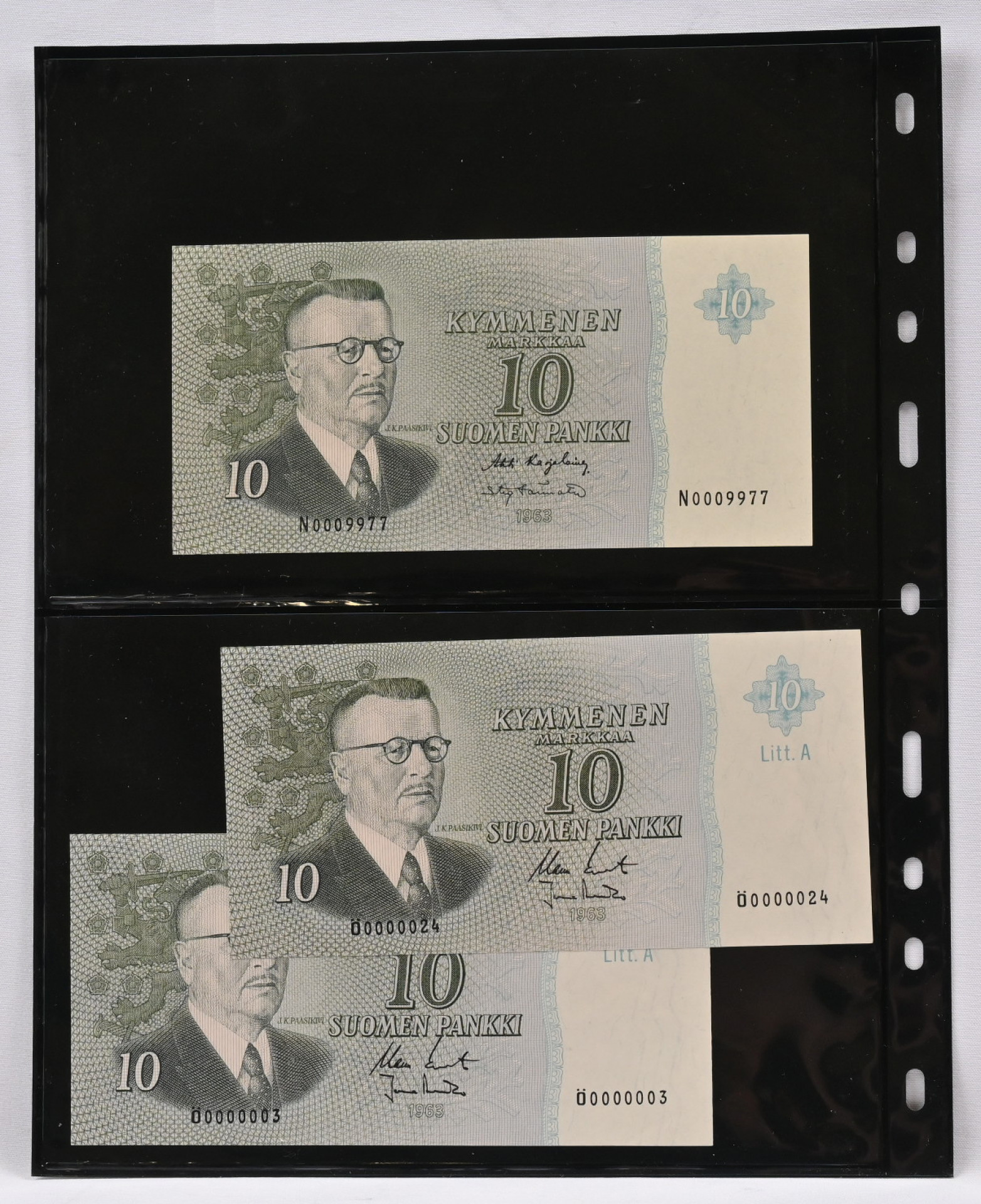 1963 10 markkaa kolme hienoa setelitä: sarjanumero N0009977 ja Litt. A Ö0000003 ja Ö0000024. Kl 0-
