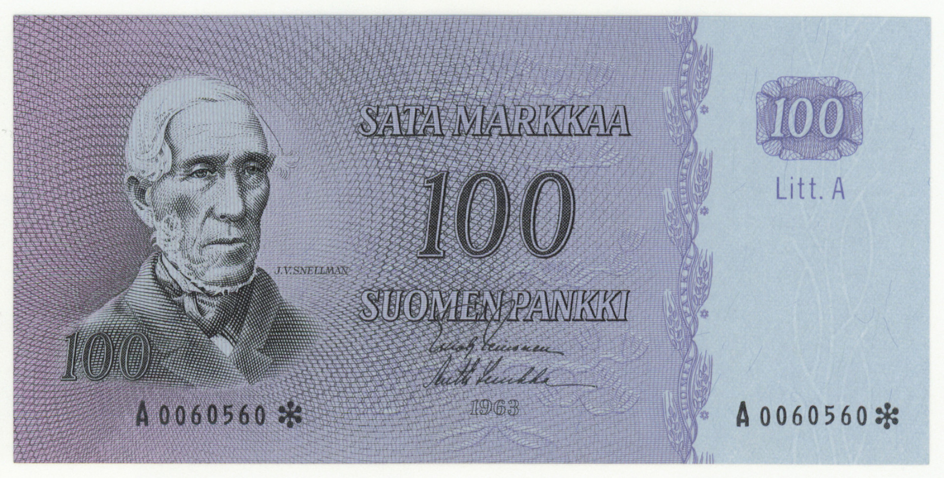 1963 100 markkaa Litt. A sarjanumero A0060560* kl 0-. Tunnetaan vain 73 kpl!