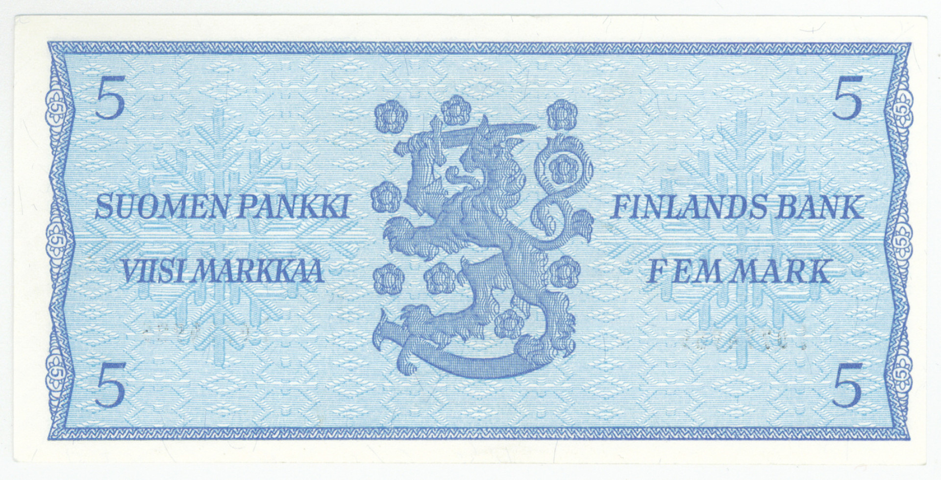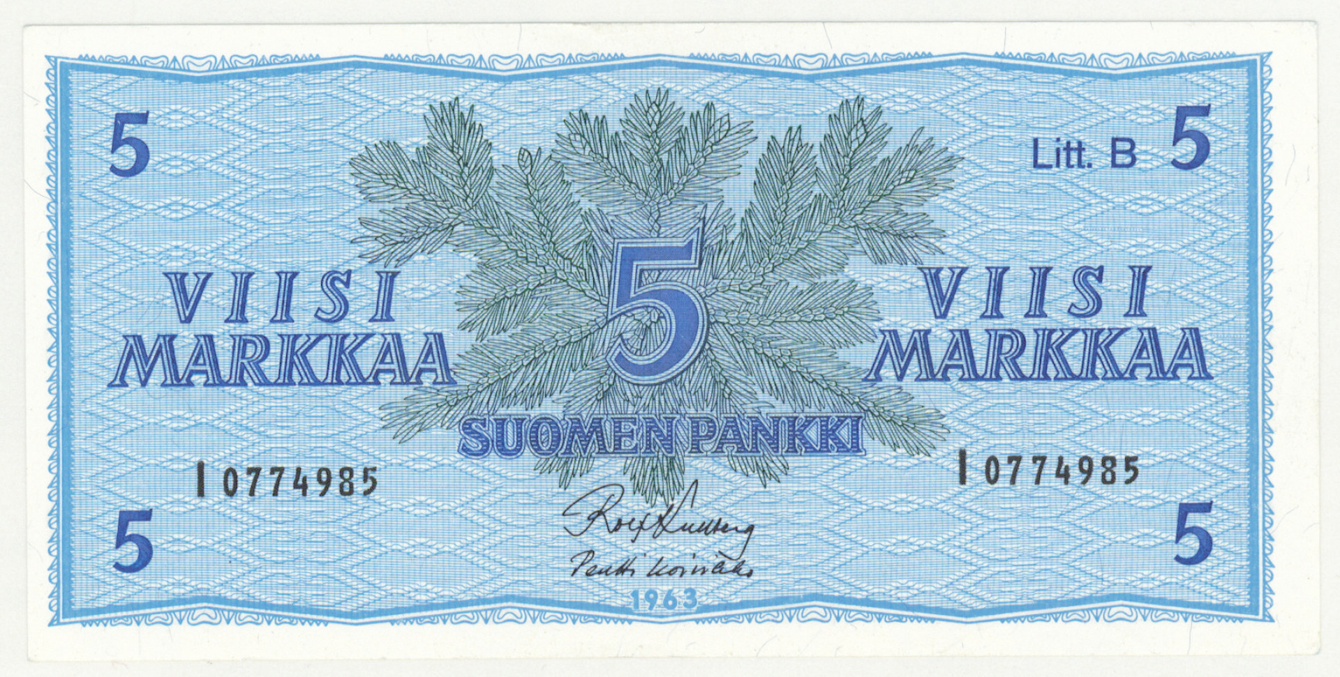 1963 5 markkaa Litt. B I -kirjain ilman tähteä, numero 0774985, kl 01-
