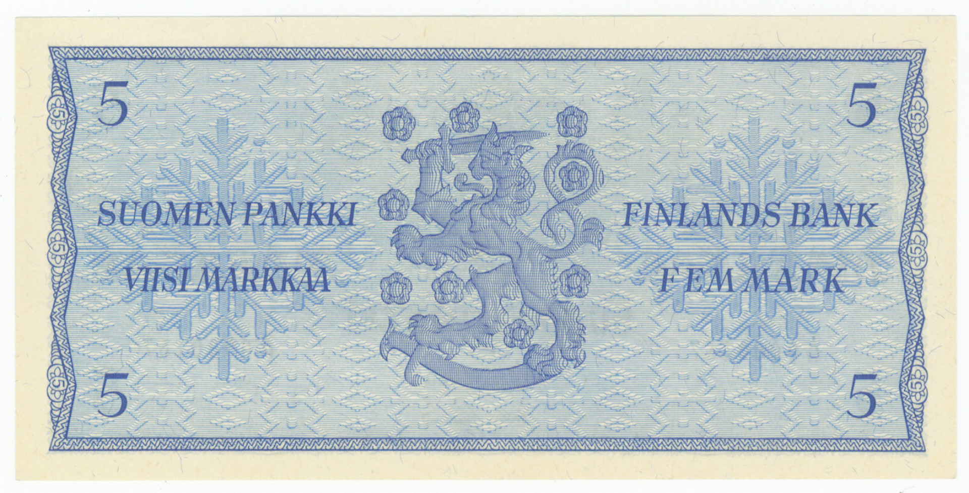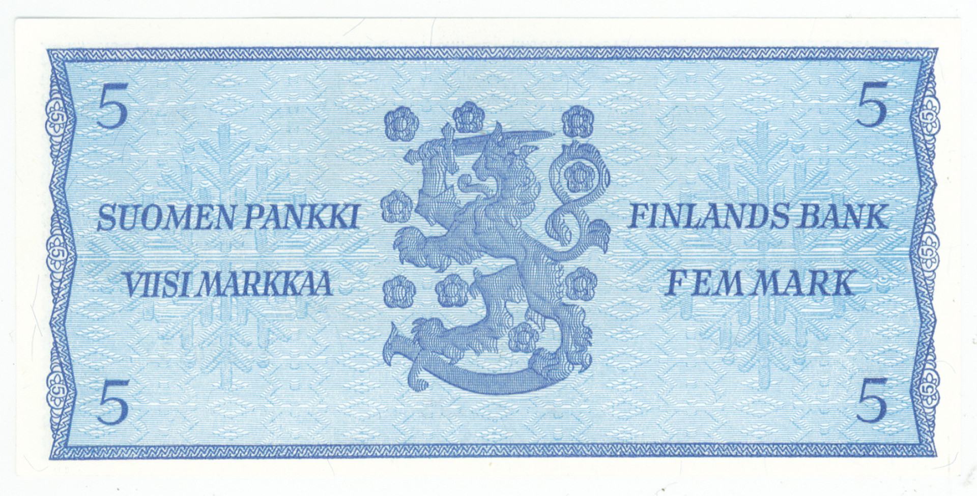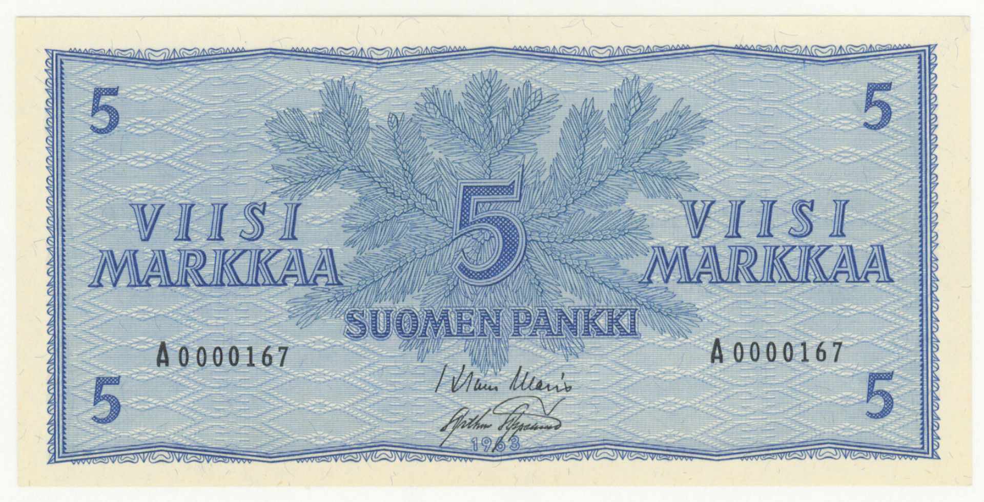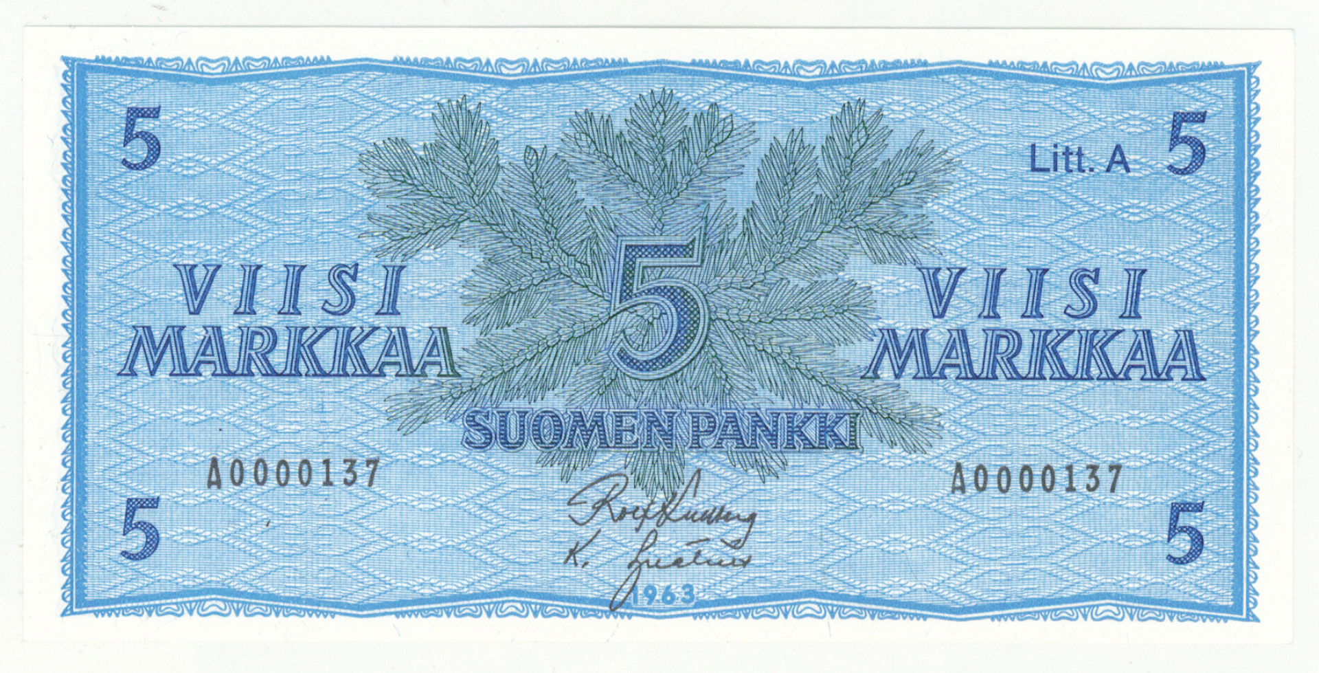 1963 5 markkaa sarjanumero A0000167 ja Litt. A sarjanumero A0000137. Kl 0-