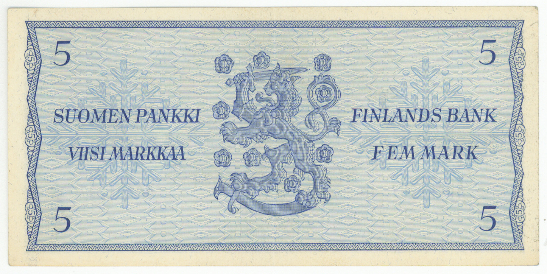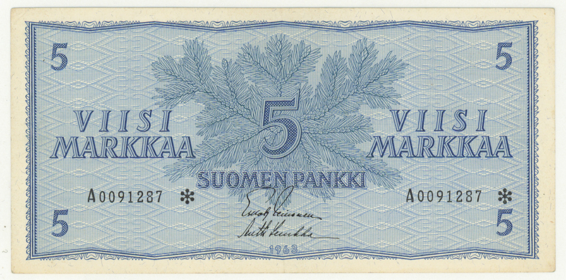 1963 5 markkaa sarjanumero A0091287 *, kl 1+