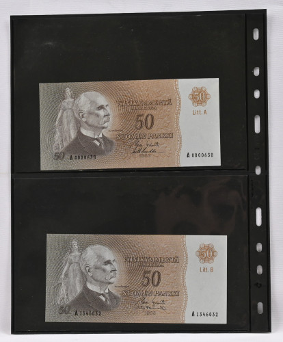 1963 50 markkaa Litt. A sarjanumero A0000638 ja Litt. B A1346032. Kl 0- / 01
