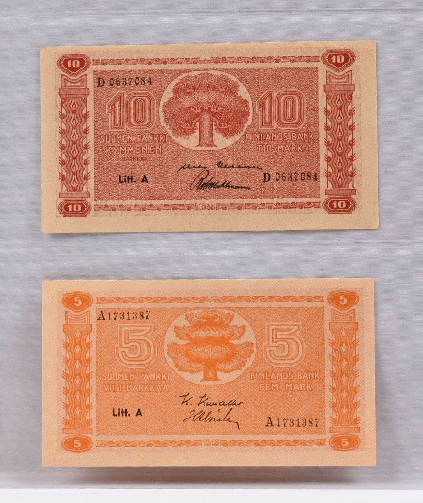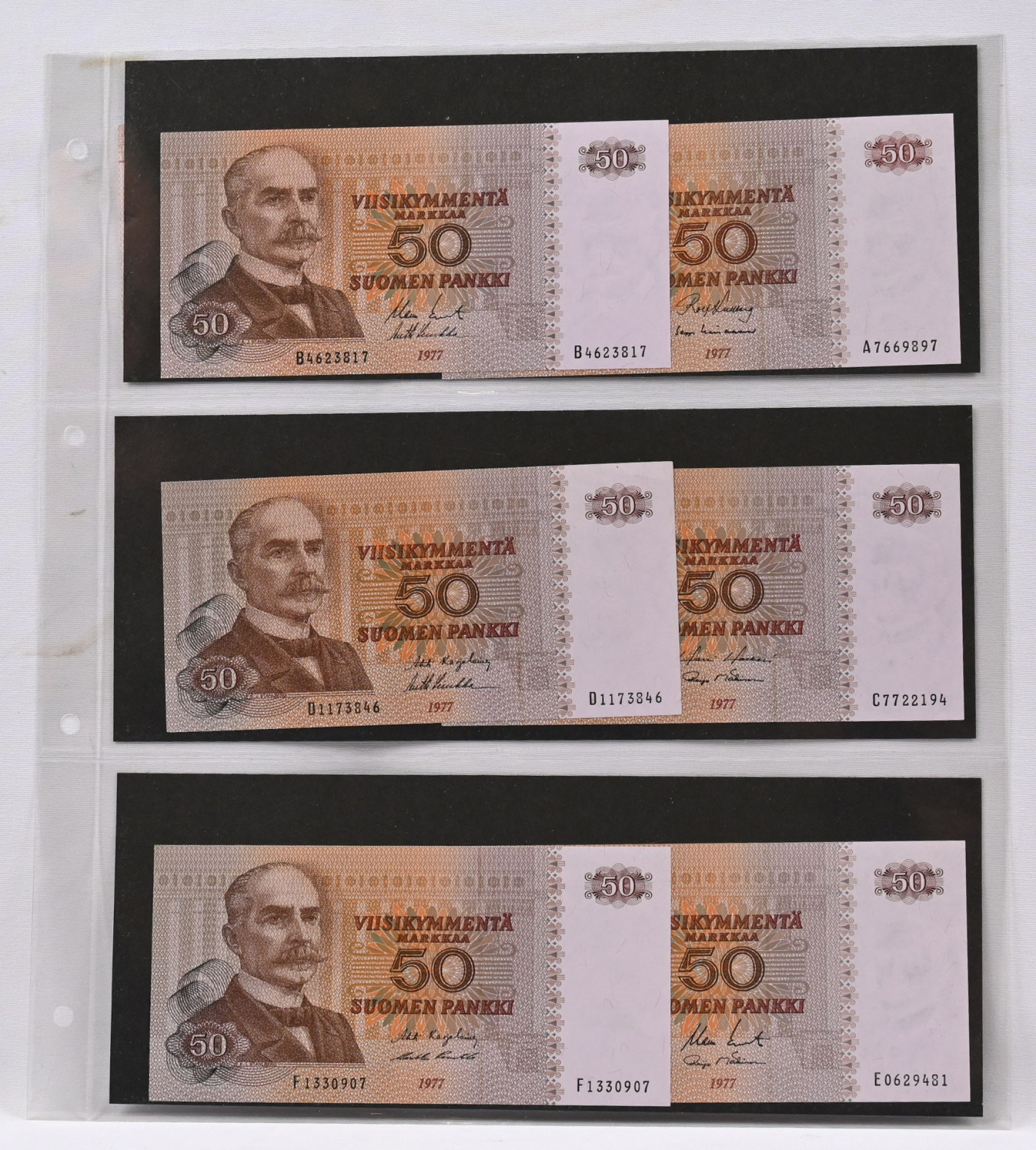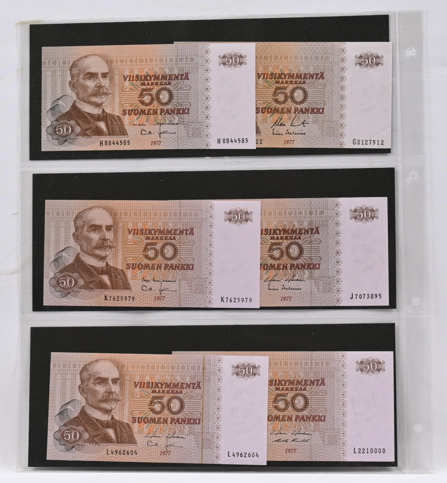 Erä 1977 50 markkaa 12 kpl sarjat A-L (L sarjaa kaksi kpl), kl 01/0. Lisäksi 1945 10 markkaa Litt. A ja 5 markkaa Litt. A, kl 01/0