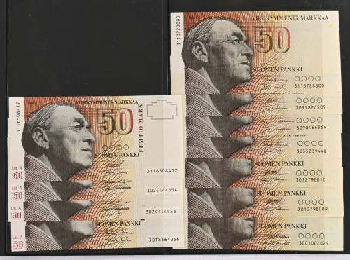 1986 50 markkaa erä seitsemän kpl ja Litt. A neljä kpl, kl 0-1 / 01
