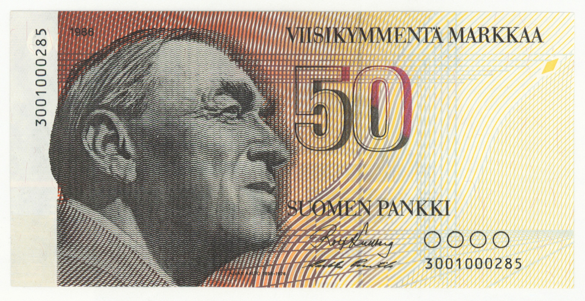 1986 50 markkaa sarjanumero 3001000285, kl 0-